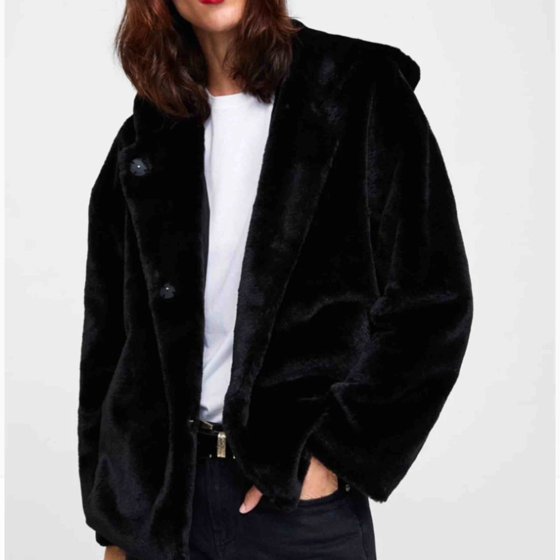 Svart jacka i syntes päls från Zara. Tidigare slutsåld. Passar både storlek S-M beroende på hur man vill att den ska sitta.