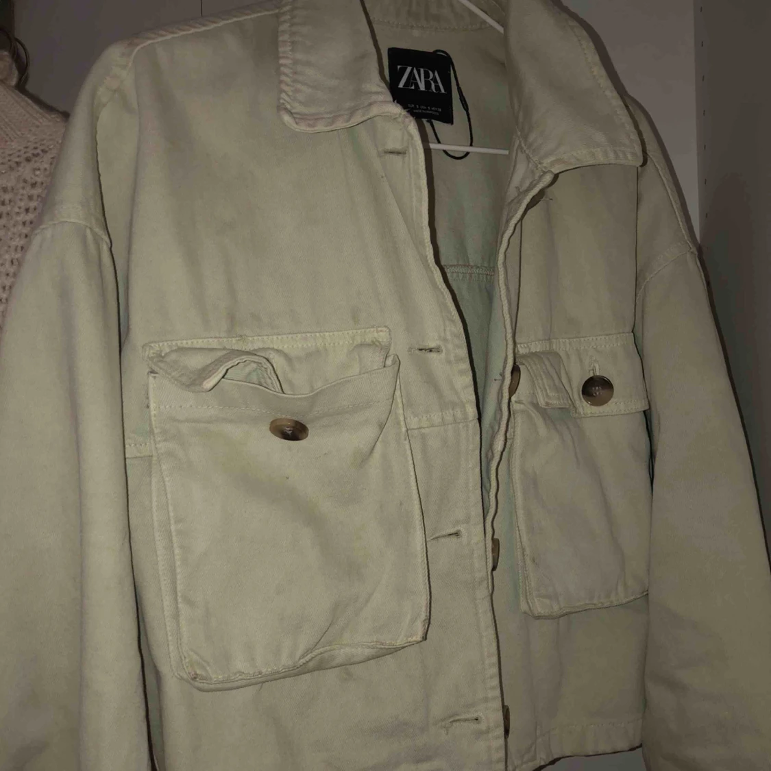 Jätte fin gräddvit/mint grön jacka från Zara perfekt nu tilm våren! Säljer den billigt pga små smutsfläckar som bortse gå bort i tvätten🍒