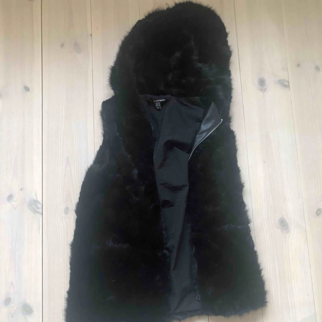 Superfin pälsväst i fuskpäls från zara i storlek s-m med luva. Endast använd ett fåtal gånger!