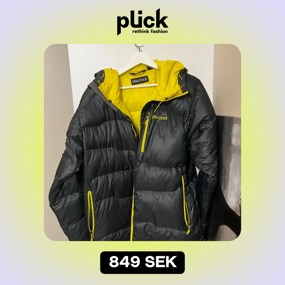Säljer en snygg svart dunjacka från Marmot med en cool gul insida och detaljer. Jackan har en praktisk huva och dragkedja framtill. Perfekt för kalla vinterdagar och höstpromenader. Den är i mycket bra skick.