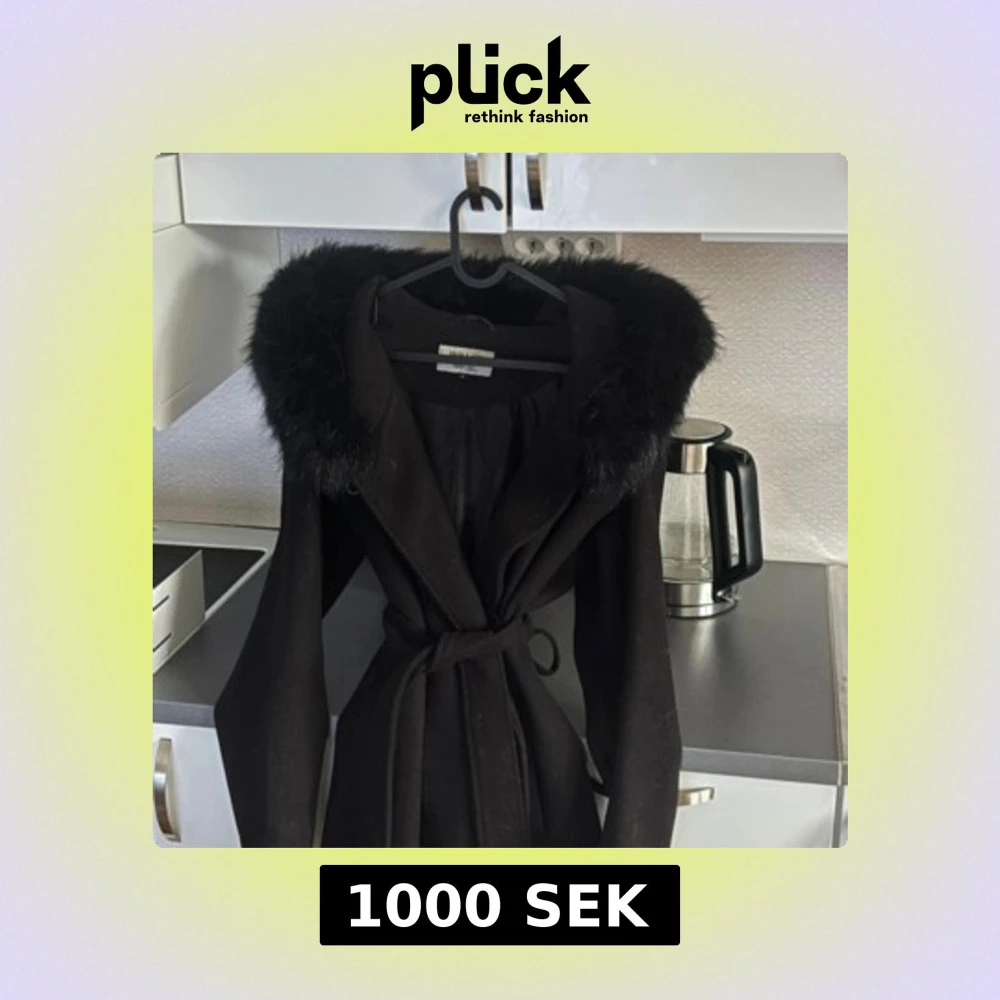 Stilren svart kappa från hollies med lång passform, fuskpäls runt kragen och knytbälte i midjan. Jackan har långa ärmar och en klassisk siluett som ger en snygg look. Perfekt för kyliga dagar när du vill vara både varm och trendig.
