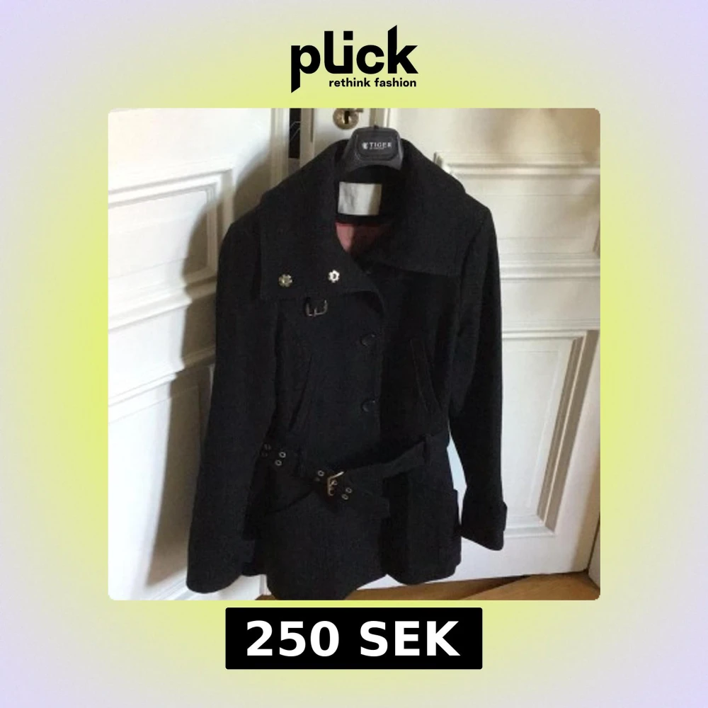 Svart varm ,äkta wool kappa från BZR of Sweden med bred krage, dekorativa knappar och ett snyggt bälte med metallspänne i midjan. Jackan har långa ärmar, fickor framtill och klassisk, stilren design. Perfekt för dig som gillar en clean look.