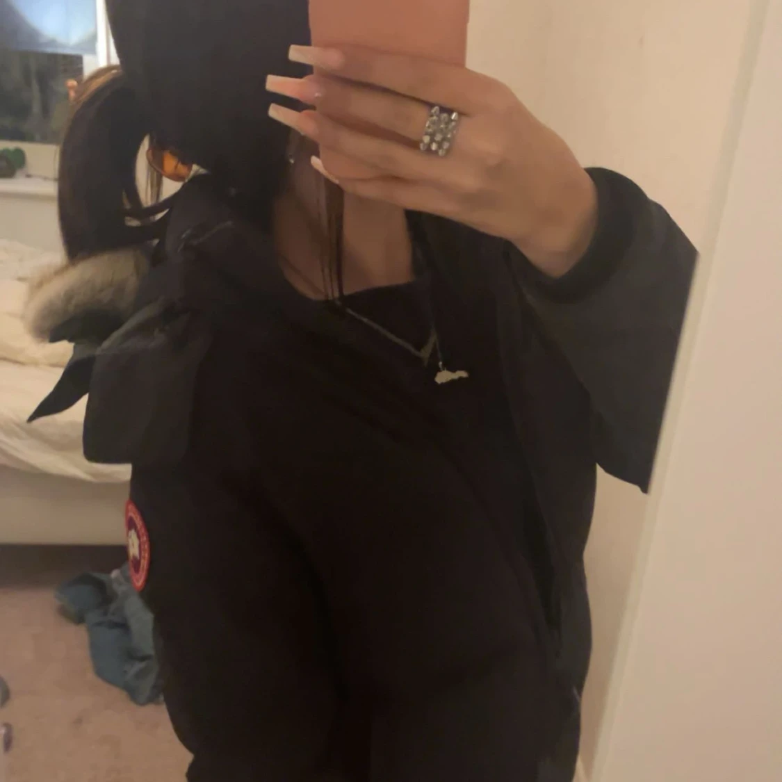 Säljer en svart dunjacka från Canada Goose med fluffig päls runt huvan. Jackan har dragkedja framtill, långa ärmar och en snygg, figurnära passform. Perfekt för kalla vinterdagar och riktigt stilren look. Priset kan diskuteras❤️ postar samma dag som köpt på.