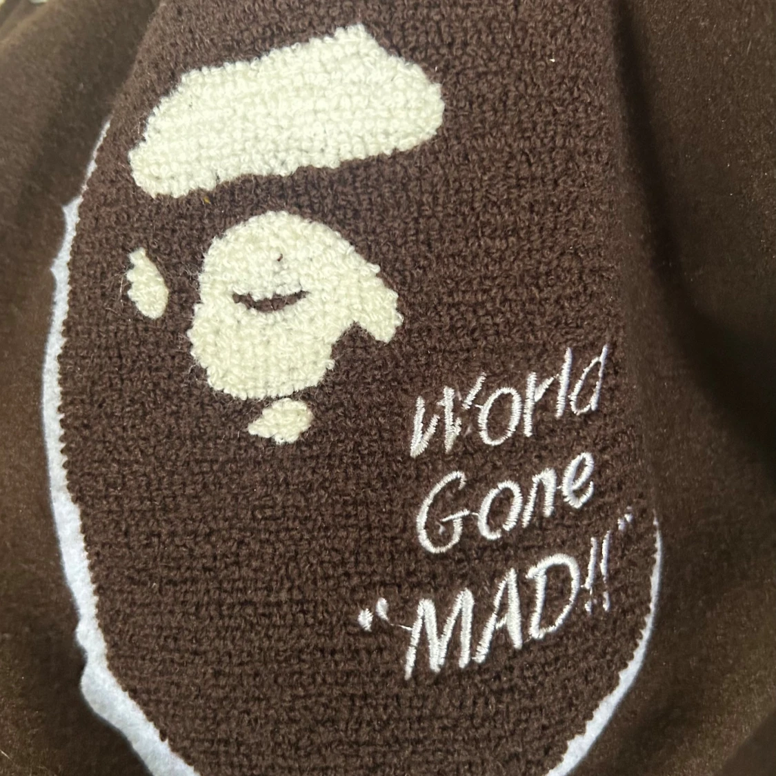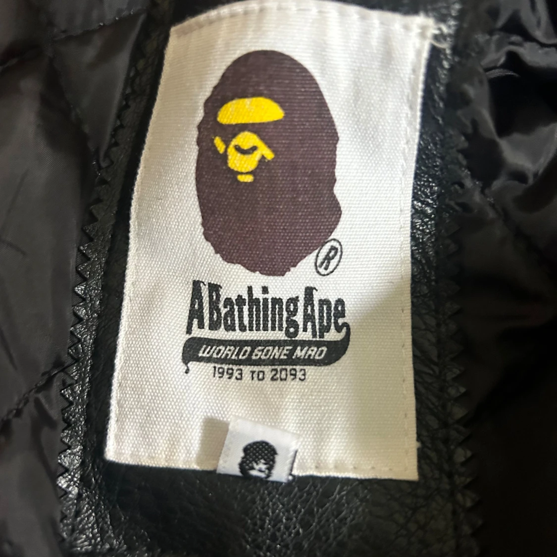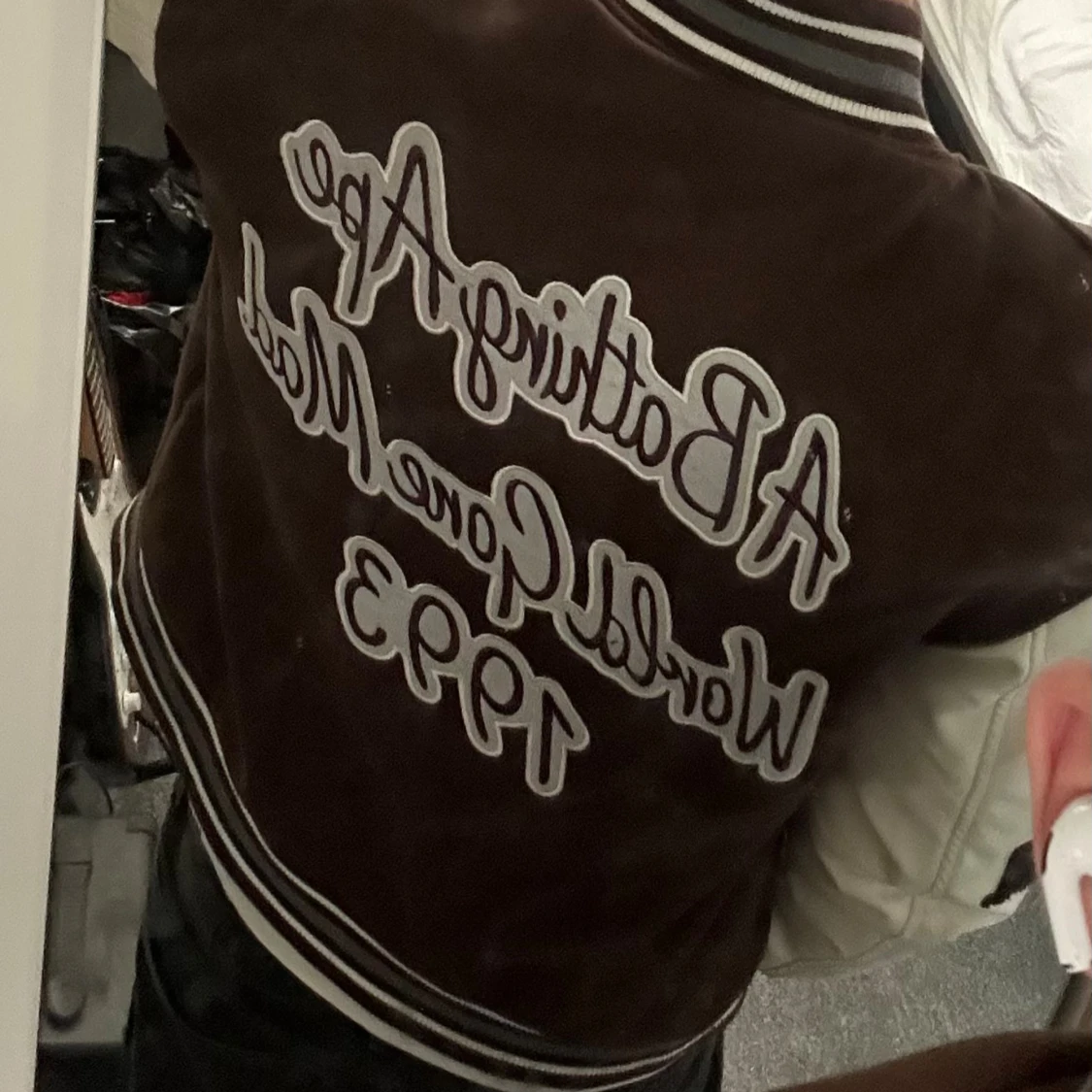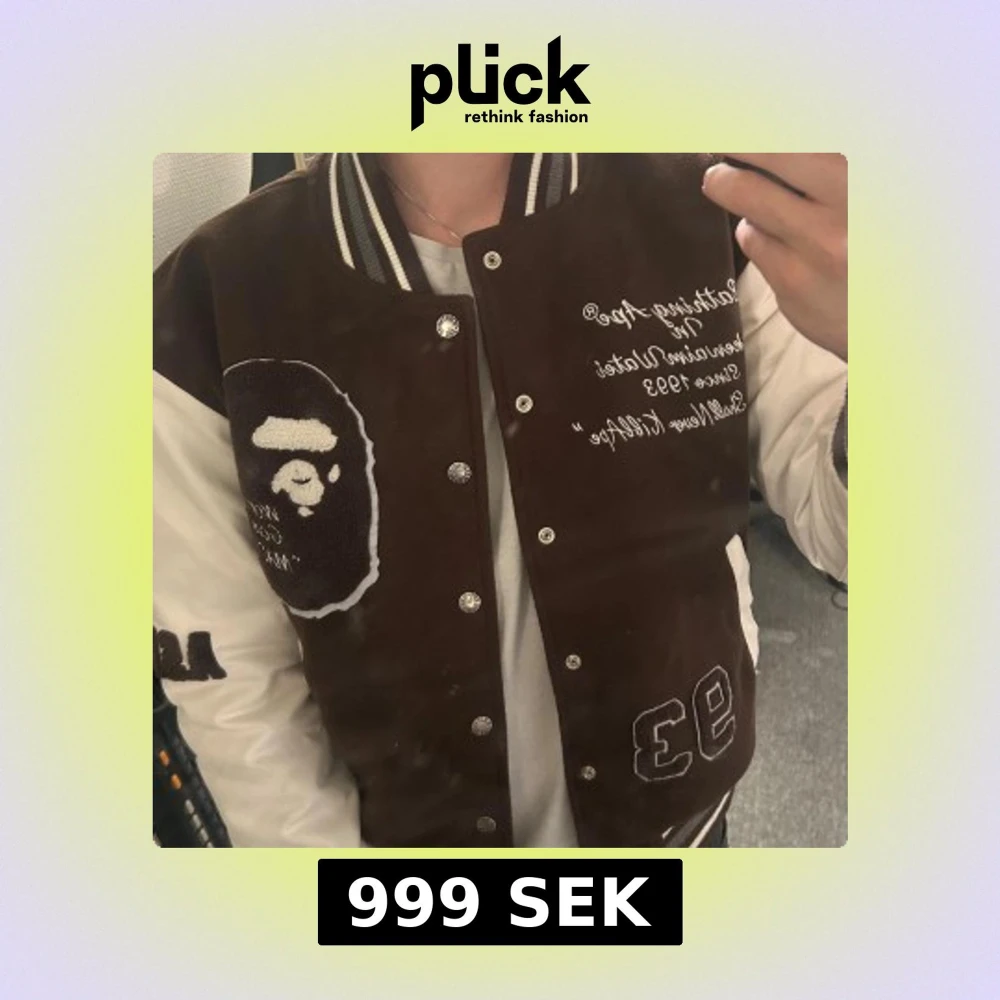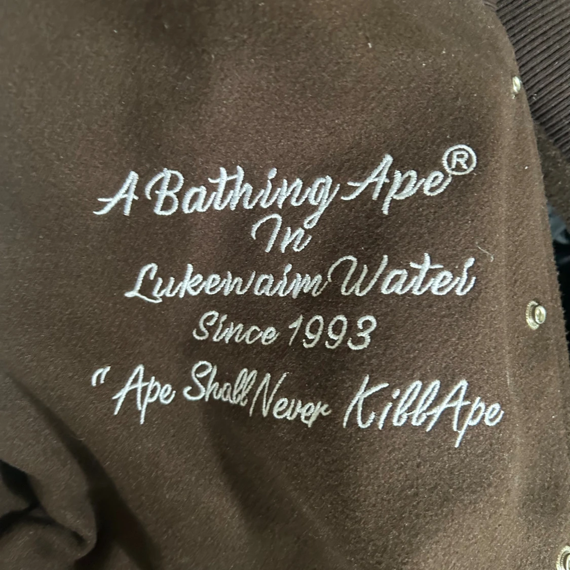 Säljer en brun och vit varsityjacka från BAPE med broderade detaljer, stora loggor och text på både fram- och baksida. Jackan har vita ärmar, bruna muddar med ränder och knappar framtill. Höger ficka är sönder och några andra skavanker som man egentligen inte tänker på. Därmed det billiga priset. Pris kan diskuteras vid snabb affär.