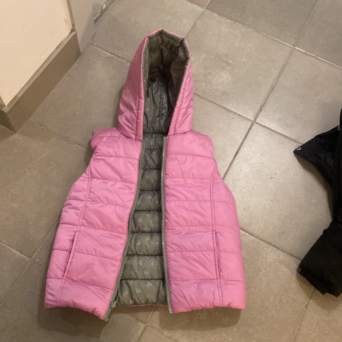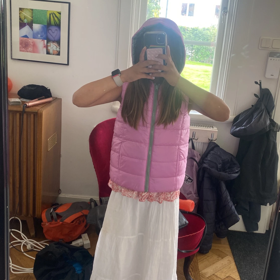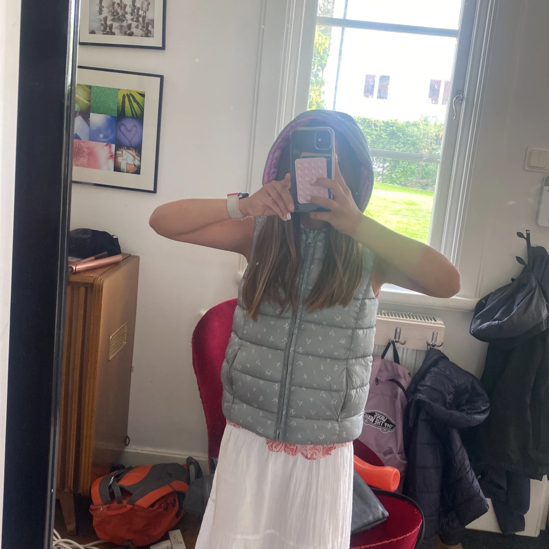 Vändbar dunväst med luva, ena sidan ljusgrön med små blommor och andra sidan ljusrosa. Västen är quiltad och har dragkedja framtill. Perfekt för dig som vill kunna variera din stil snabbt. Snygg och mysig att bära över hoodie eller tröja.