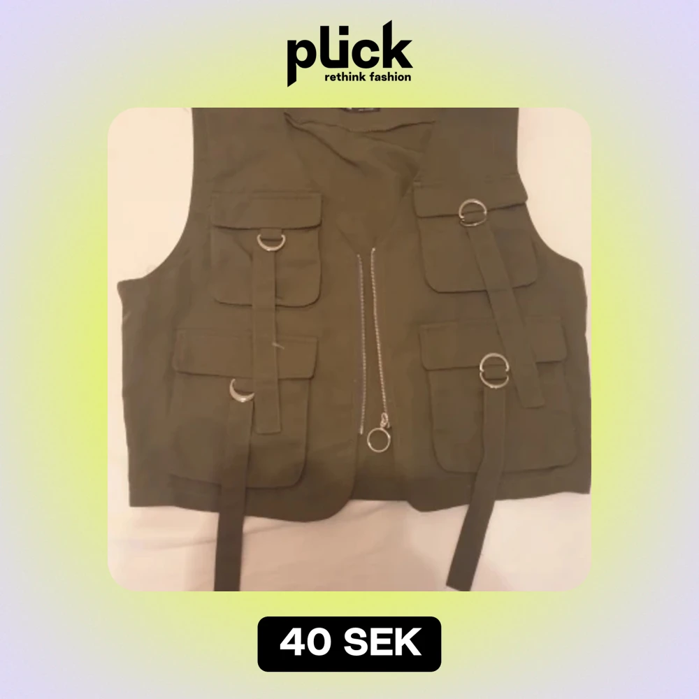 En grön väst med flera fickor och spännen. Västen har en dragkedja framtill och är kort i modellen. Säljs för 40