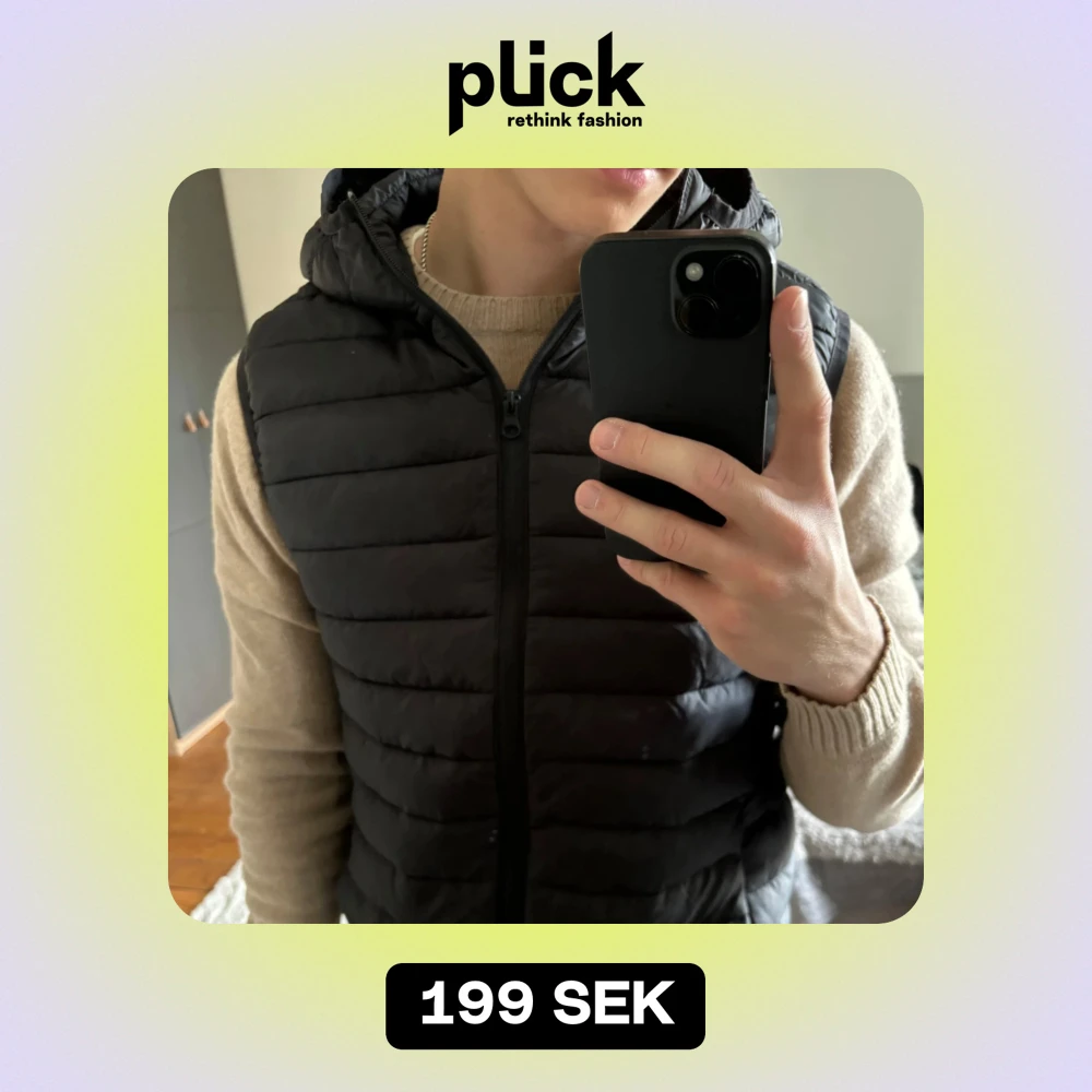 Säljer en svart väst med luva i bra skick från HM. Inte använd på ca 2 år. Personen på bilden är 180cm lång.