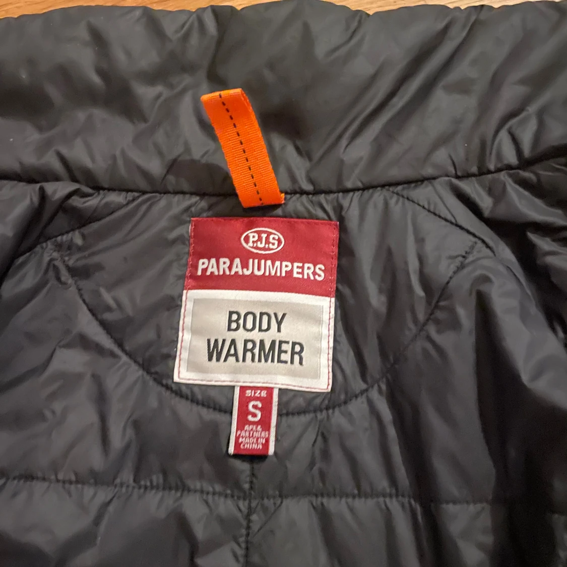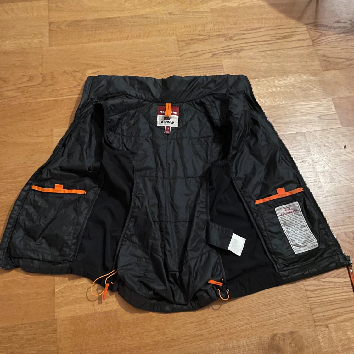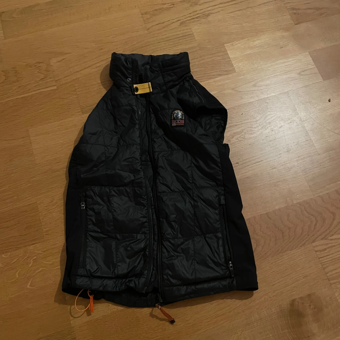 Svart quiltad dunväst från Parajumpers med hög krage, dragkedja och orange detaljer. Västen har flera fickor och klassisk PJS-logga på bröstet och ryggen. Perfekt för lager-på-lager och snygg till hösten. Modell: Body warmer Skick: Bra förutom litet hål på magen Storlek: S