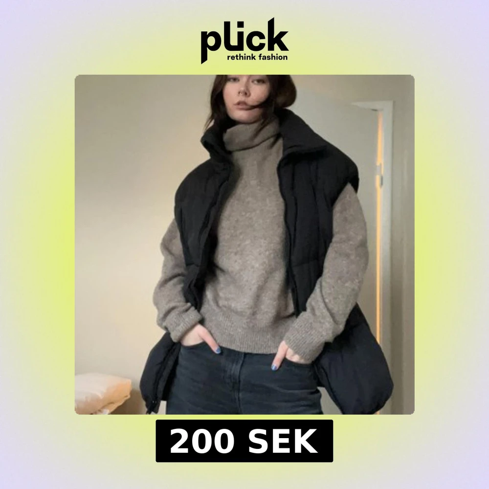 Snygg, varm och superbekväm svart dunväst med dragkedja. Perfekt för lager-på-lager under kyliga dagar. Västen har en hög krage för extra värme och stil. I jackan står storleken xs, men den är oversized på mig som bär S.