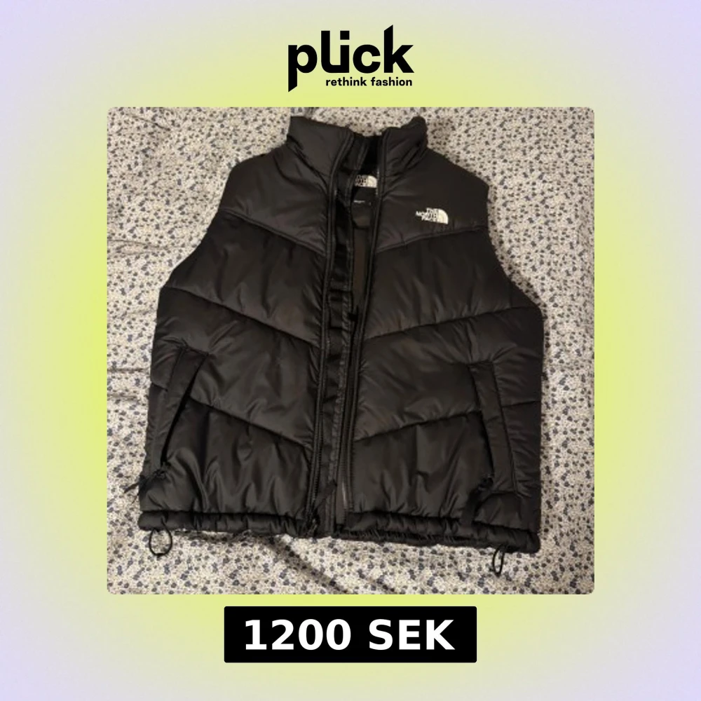 Säljer en svart dunväst från The North Face med hög krage och dragkedja framtill. Västen har två snedställda fickor med dragkedja och justerbar dragsko nedtill. Klassisk logga på bröstet och ryggen. Perfekt för lager-på-lager under kyliga dagar. Nypris:2200kr, Endast använd 1 gång