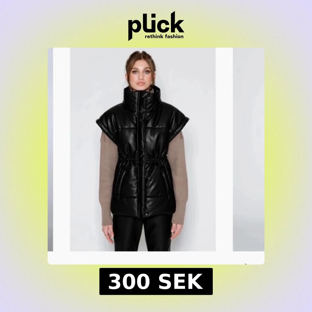 Snygg svart väst med hög krage och korta ärmar. Västen har en dragkedja framtill och elastisk midja för en bekväm passform. Perfekt för lager-på-lager under kyliga dagar. I skinnimitation från märket LXA. Väl använd men i gott skick.