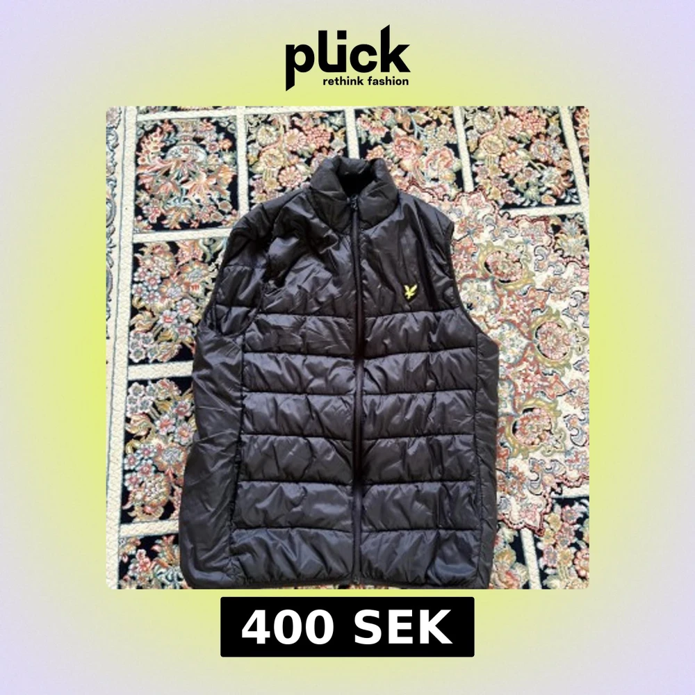 Säljer en svart dunväst från Lyle & Scott med dragkedja och en liten logotyp på bröstet. Västen har en quiltad design och är perfekt för kyligare dagar. Den är lätt och smidig att bära.