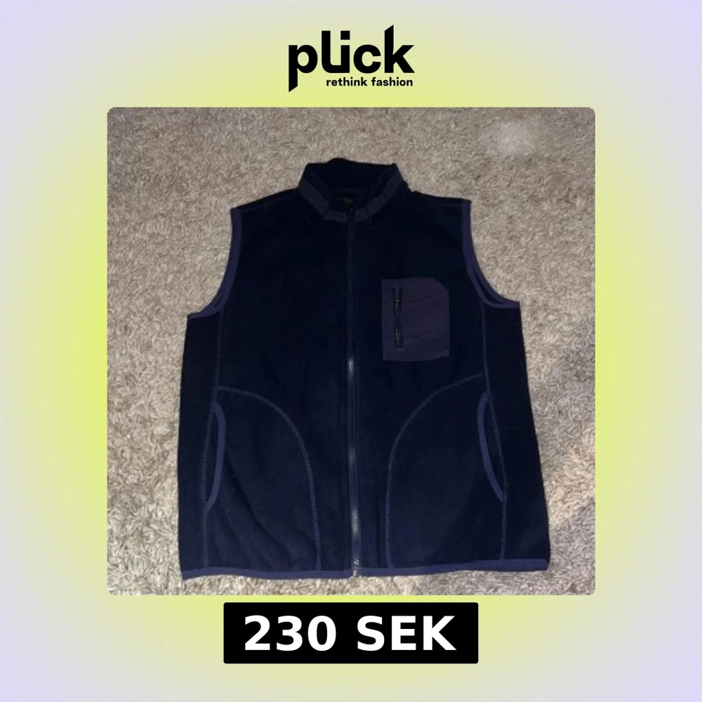 Mörkblå fleeceväst med dragkedja. Inget varumärke.