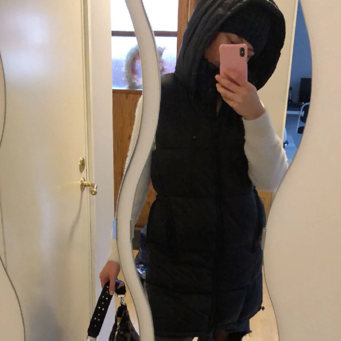 En längre väst som är justerbar i midjan och med huva från Zara. Finns fickor men syns inte på bilden