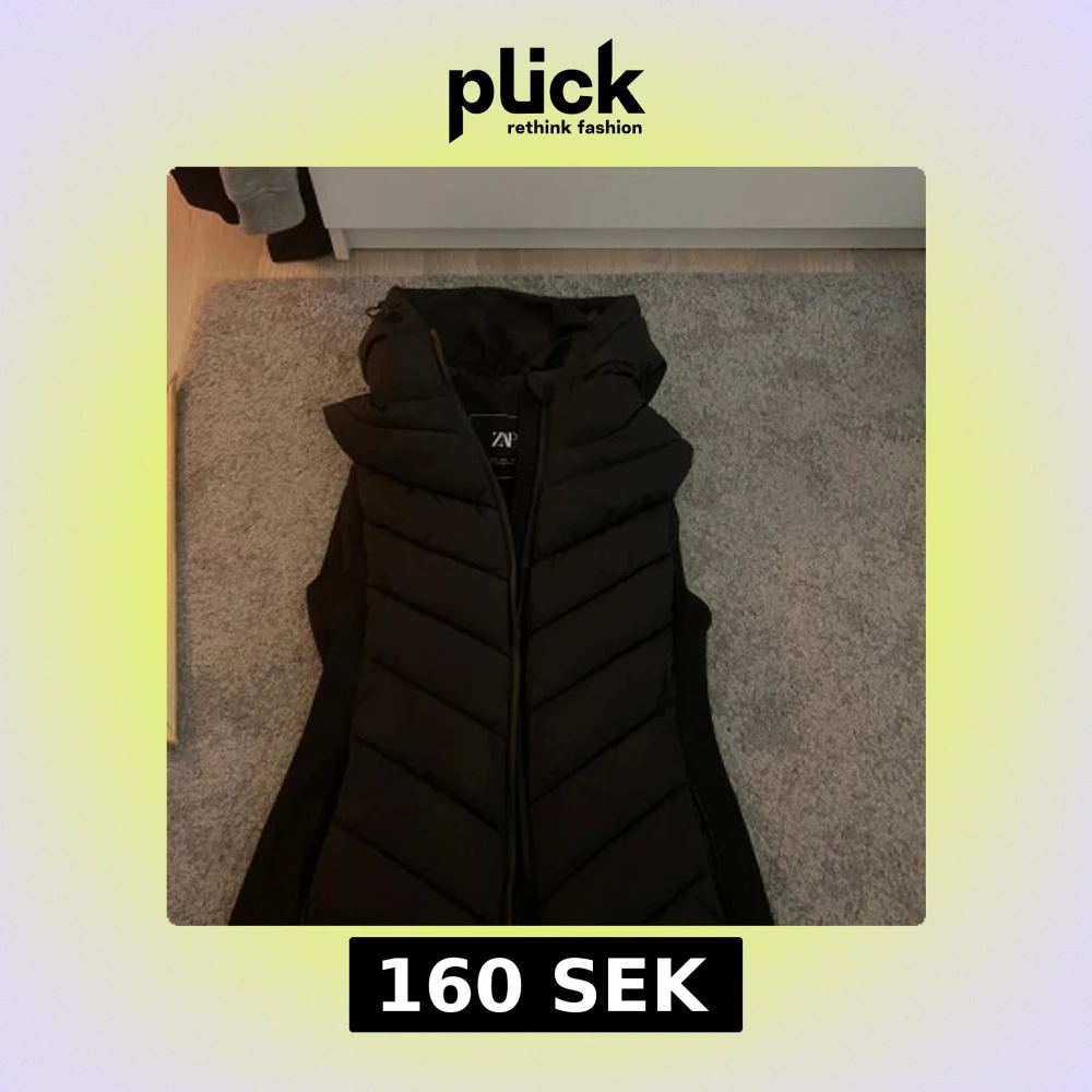Snygg svart dunväst från Zara med huva och dragkedja. Använd fåtal gånger och i princip i nyskick. Pris går att förhandla 😊