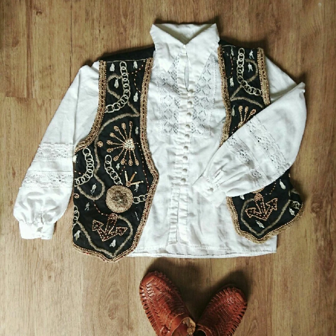 Hur cool e inte denna? Väst dekorerad med diverse saker, bland annat snäckor, tråd, trä, pärlor, rep mm. Markerad S men tror det är herrstorlek.