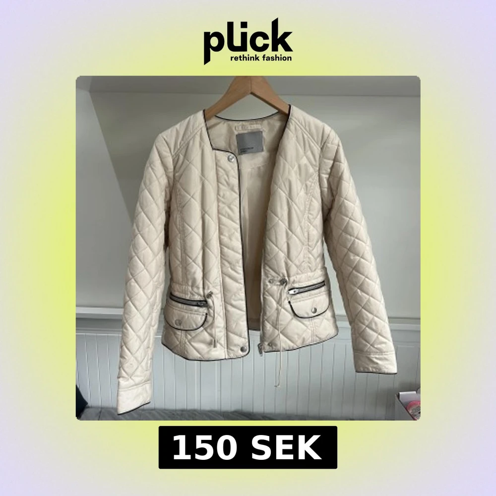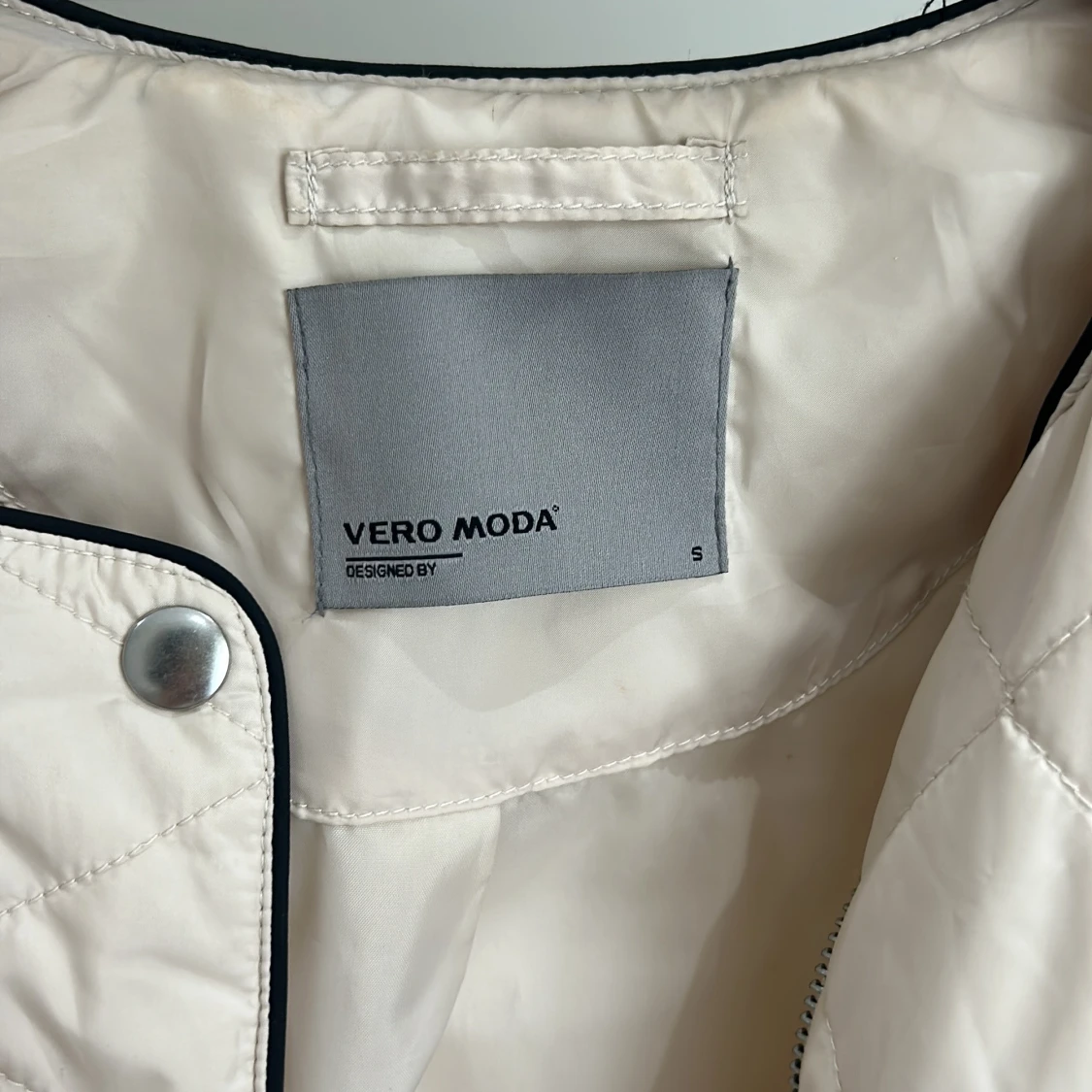 Snygg quiltad beige jacka från Vero Moda med svarta detaljer och dragkedjor vid fickorna. Jackan har lång ärm, rund halsringning och markerad midja med dragsko. Perfekt för vår och höst.