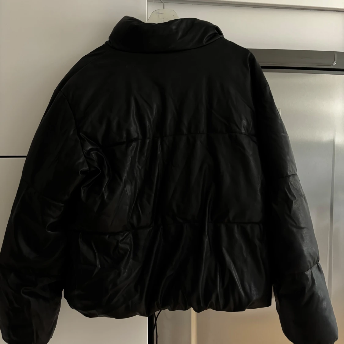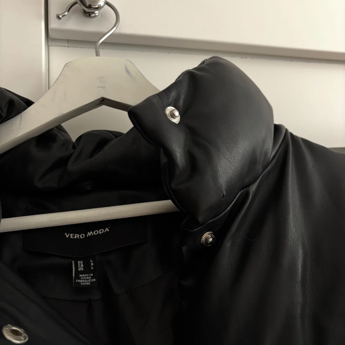 Säljer en svart pufferjacka från Vero Moda i storlek L. Jackan har en cool oversized passform, hög krage med tryckknappar framtill. Jackan är i skinnimitation