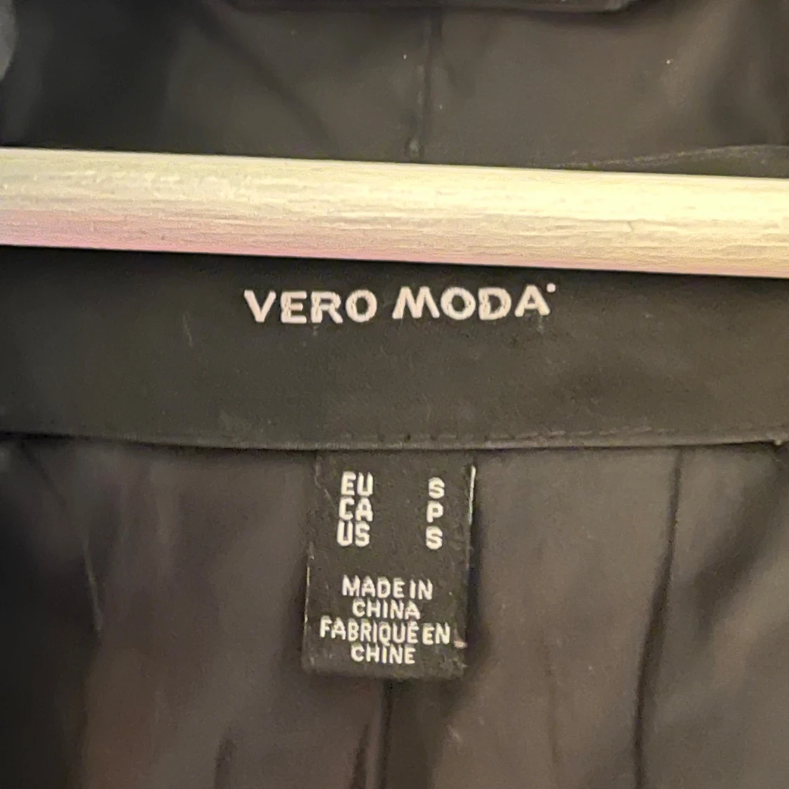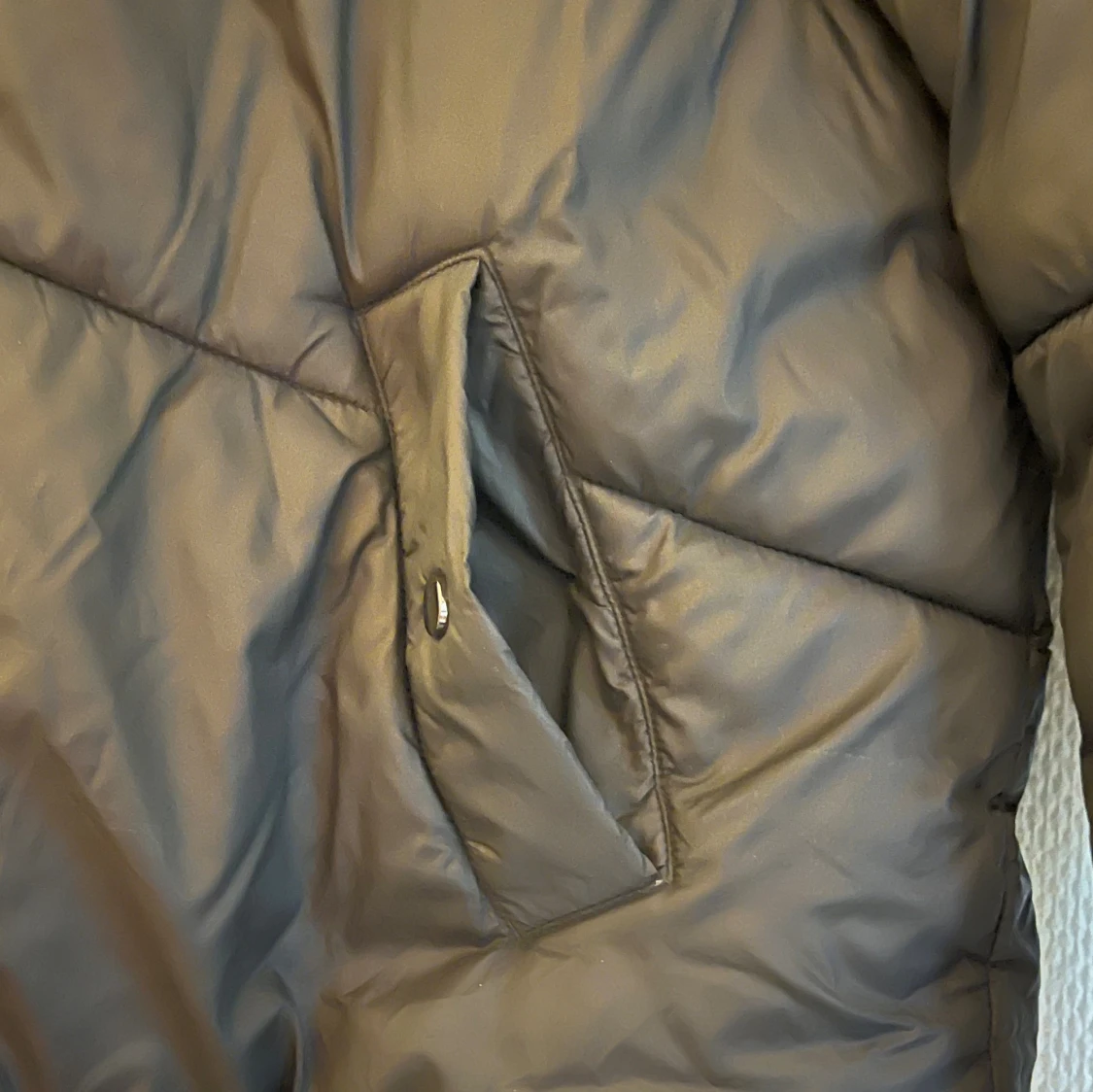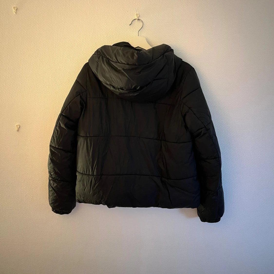 Svart pufferjacka från Vero Moda med huva och dragkedja framtill. Jackan har två snedställda fickor med knappstängning och quiltad design. Perfekt för kyliga dagar och har en klassisk, enkel look. (Knappen på höger ficka är borta så den går ej att stänga )