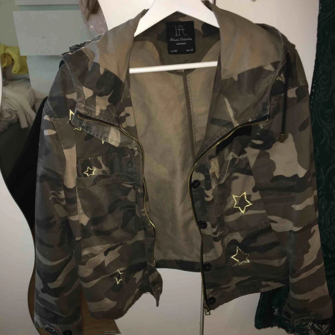 En tunn jacka i kamoflach. Med stjärnor i guld och en luva.