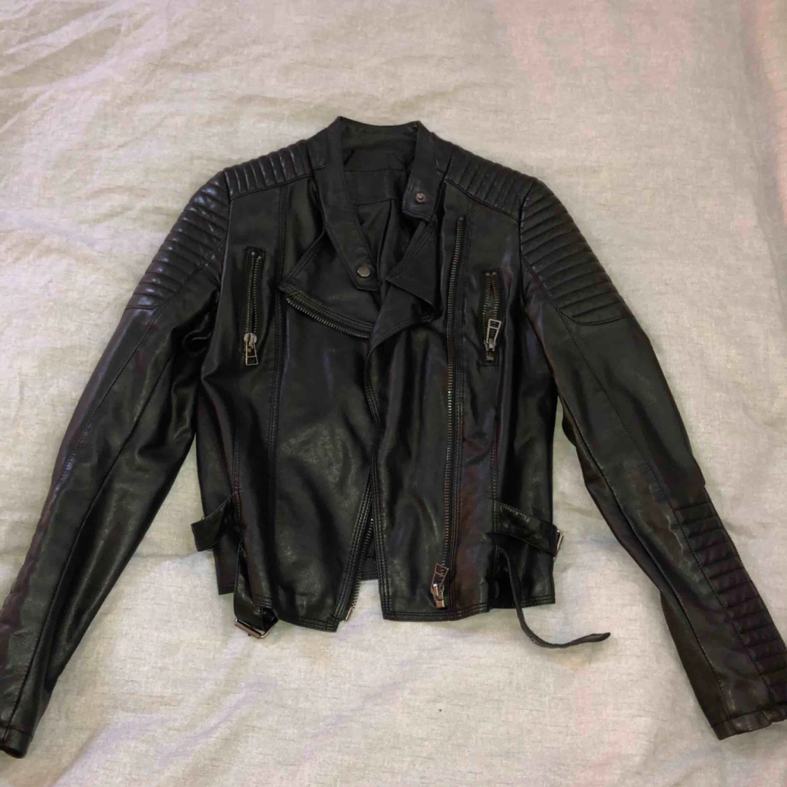 Svart skinnjacka, aldrig använd. Är rätt stor så tror att den skulle passa M också. Frakt ingår i priset