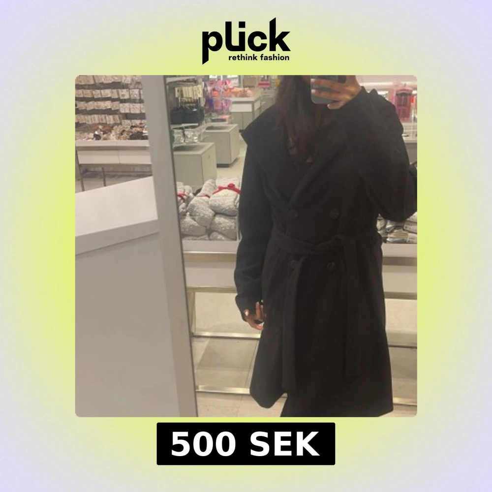 Säljer en stilren svart kappa med en luva och knappar framtill. Jackan har ett bälte i midjan för en snygg passform och långa ärmar. Perfekt för kyligare dagar! (Pris går att diskutera) har ett litet hål inre i jackan vid armhålan men inget man märker av då av priset