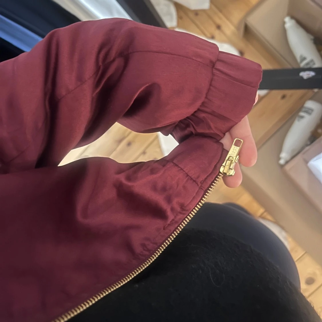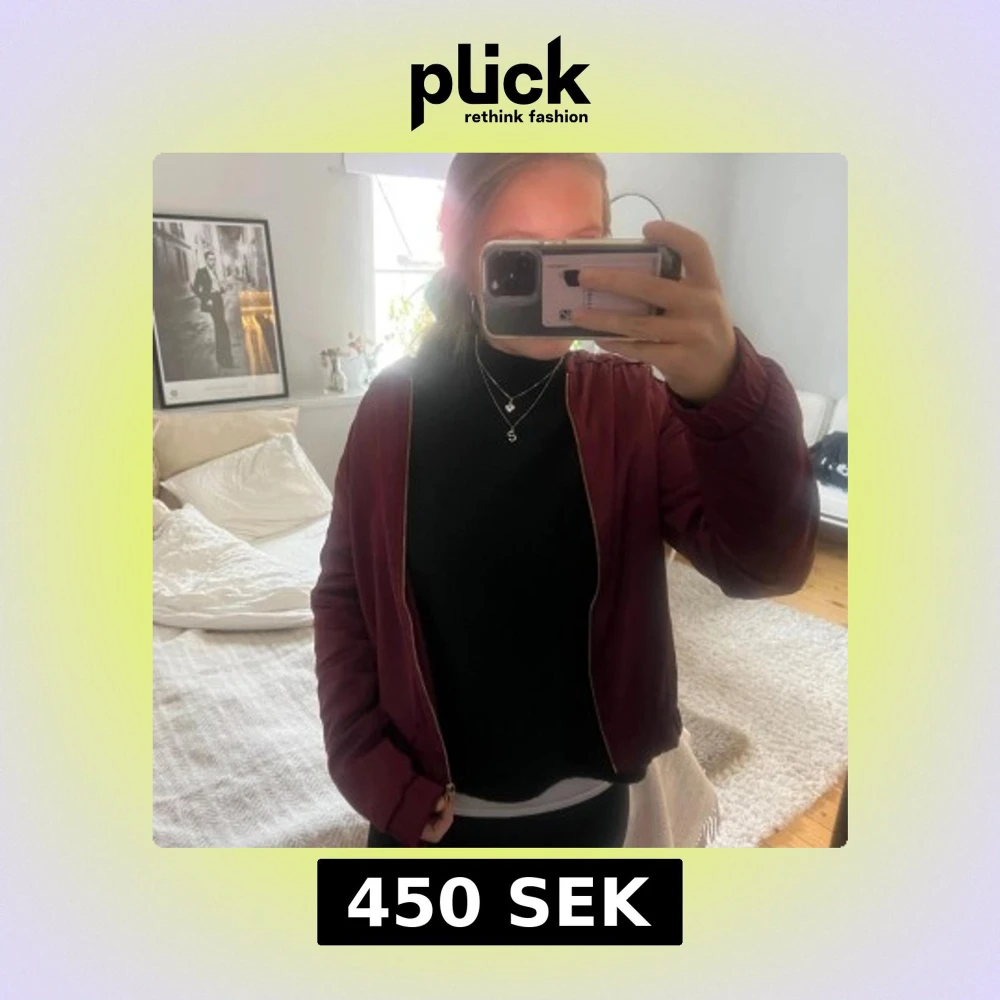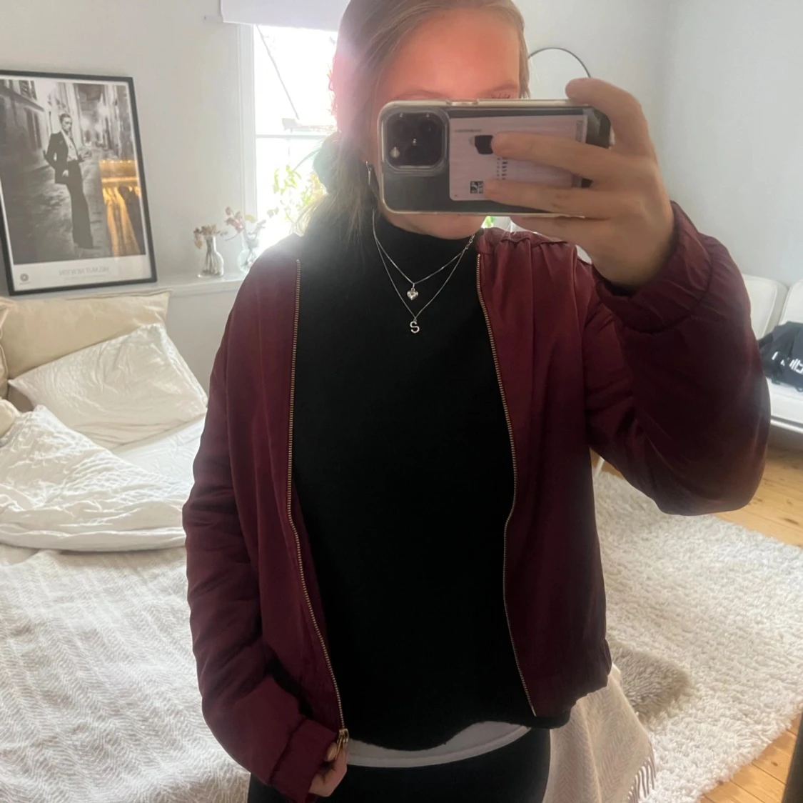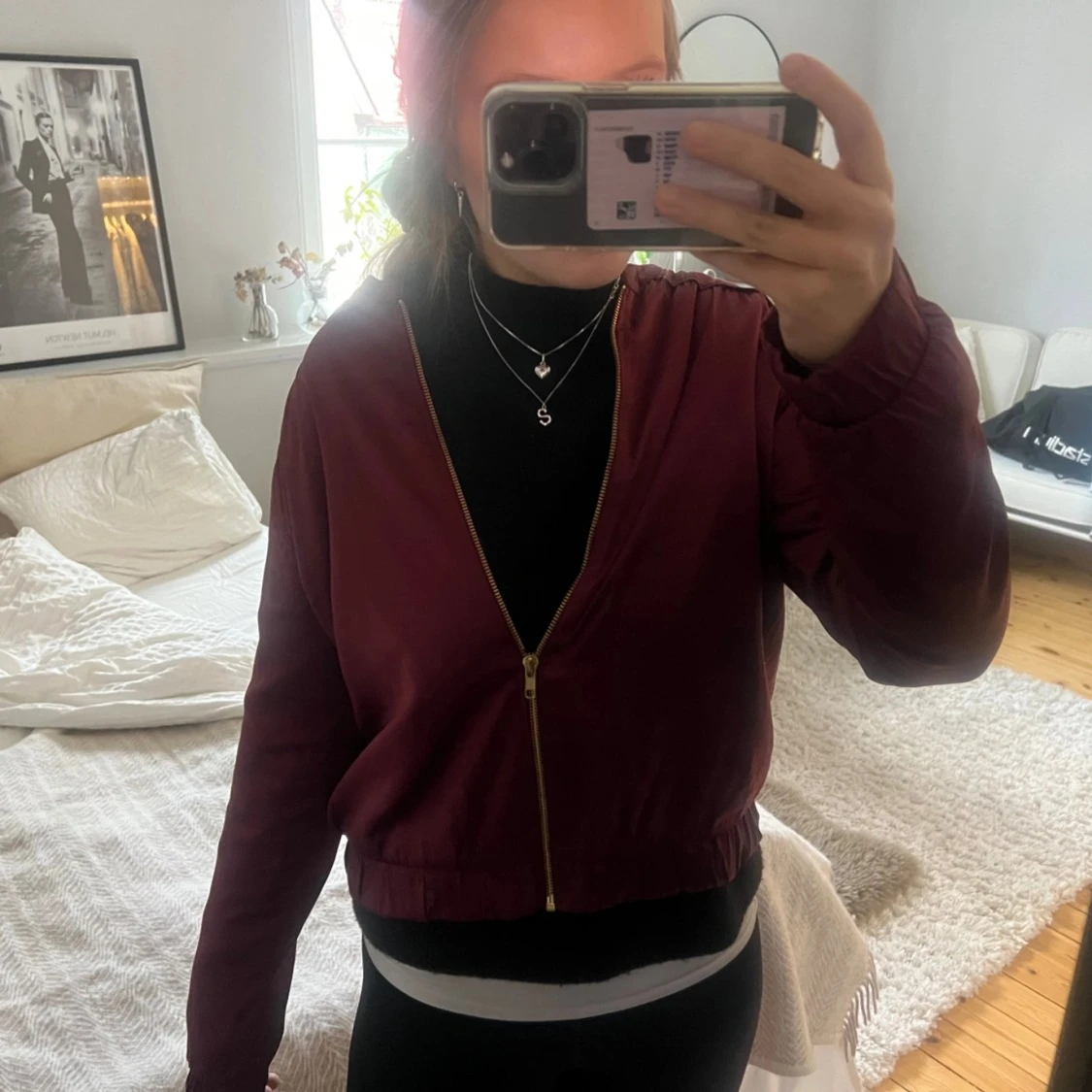 Säljer en snygg vinröd bomberjacka med dragkedja. Jackan har långa ärmar och en stilrent design som passar perfekt för höst, vår och även lite kallare sommarkvällar. Köpte på sellpy ”nytt skick” och har inte använt sedan dess. Hör av er vid mer frågor.