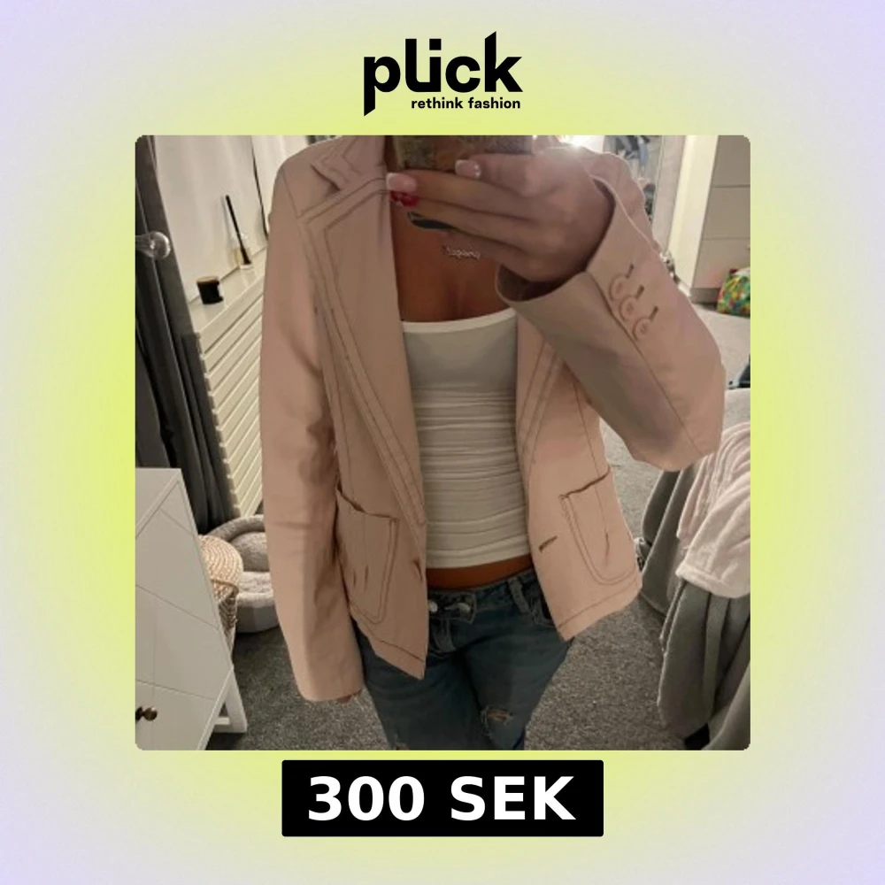 Säljer en ljusrosa kavaj från Vila i storlek S. Kavajen har klassisk krage, två fickor framtill och knappar vid ärmslutet. Insidan är fodrad med ett snyggt randigt tyg i beige och rött. Perfekt för en trendig och stilren look.