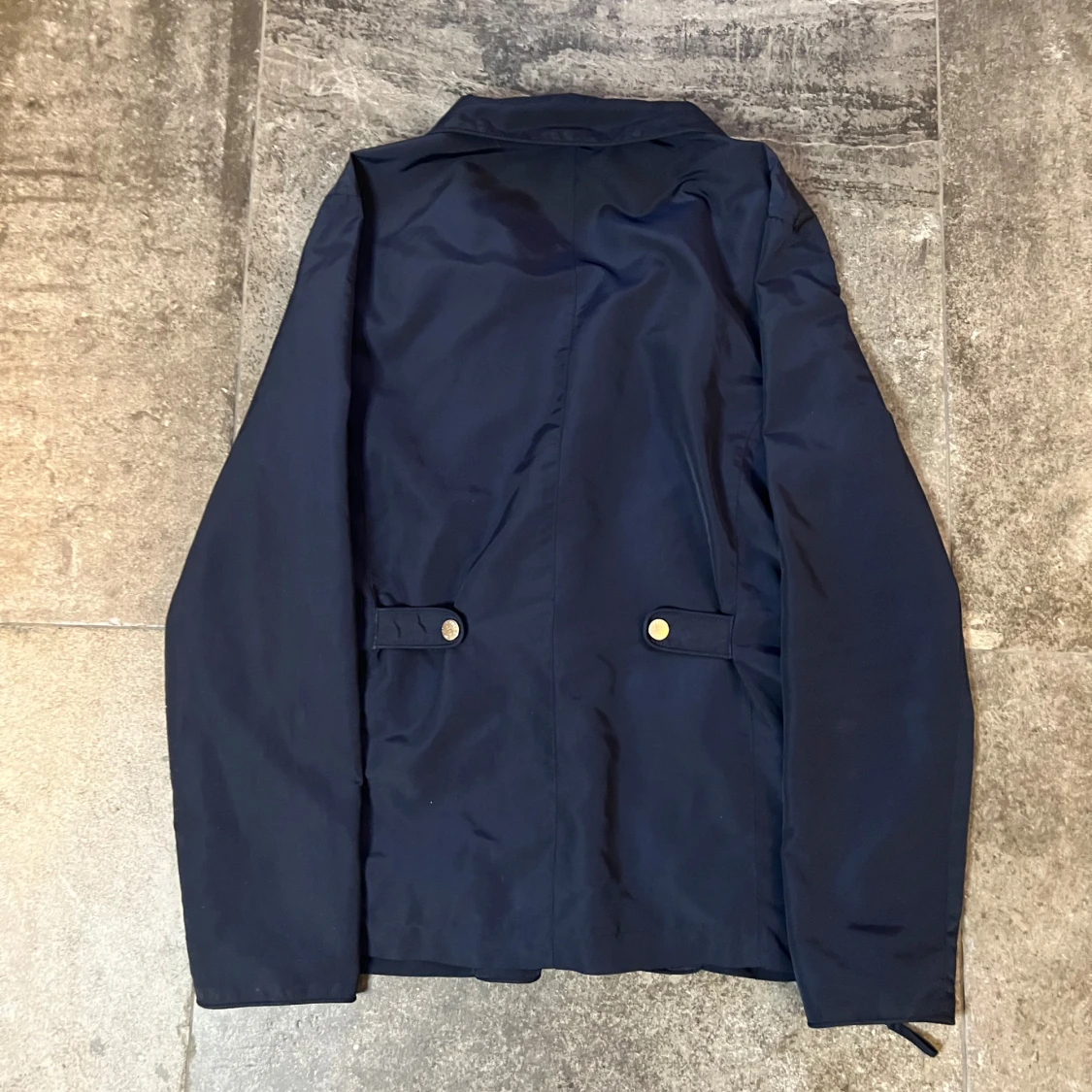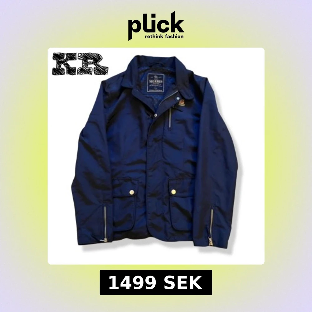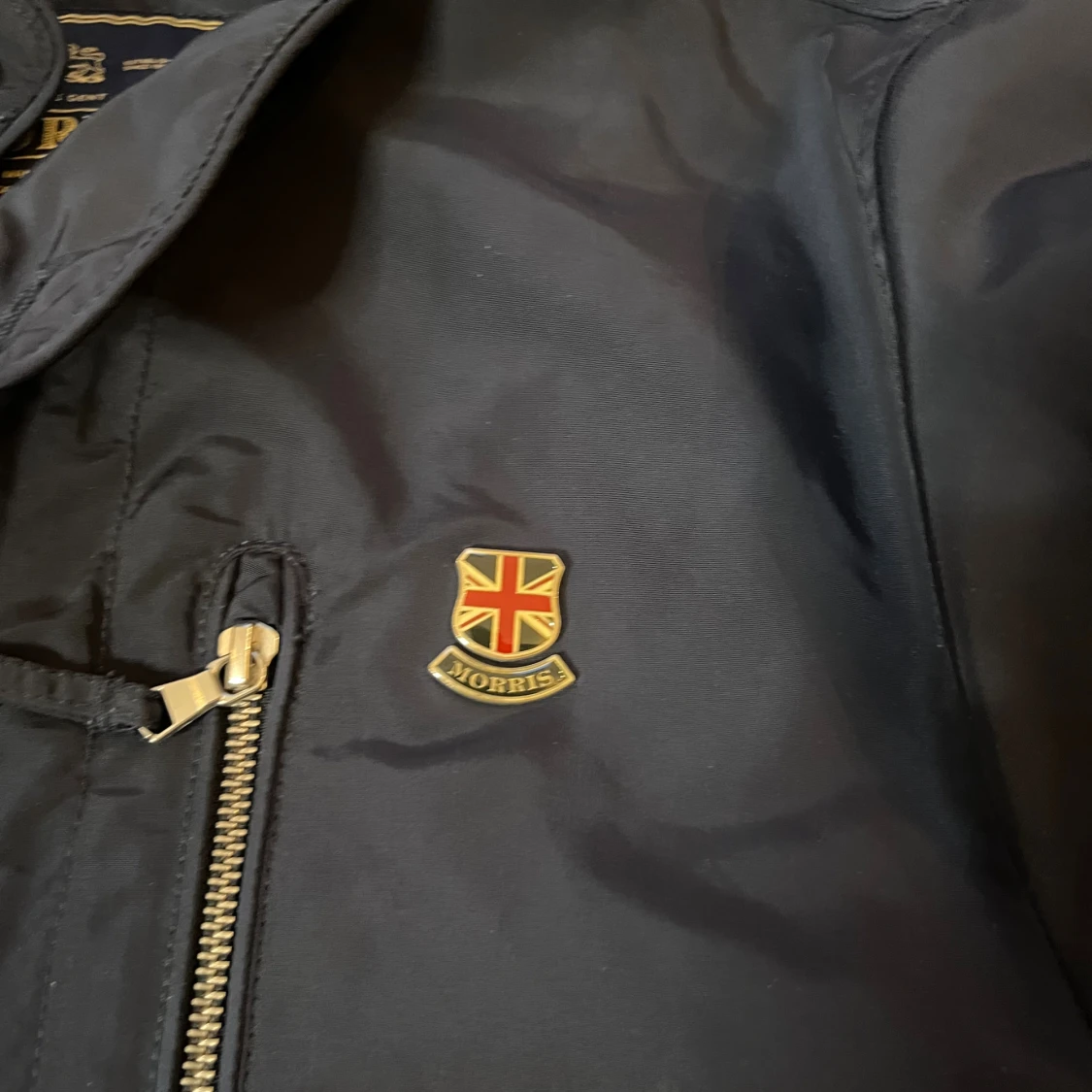 Snygg marinblå vindjacka från Morris med klassisk krage, guldfärgade detaljer och dragkedjor vid ärmslut. Jackan har två stora fickor med knappar och ett Morris-emblem på bröstet. Insidan har diskret prickigt foder för extra stilpoäng.