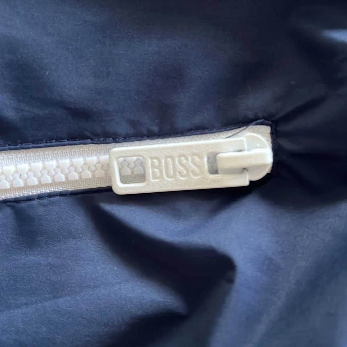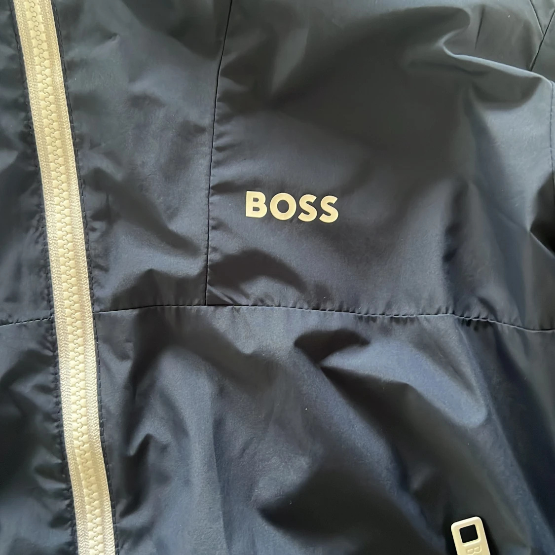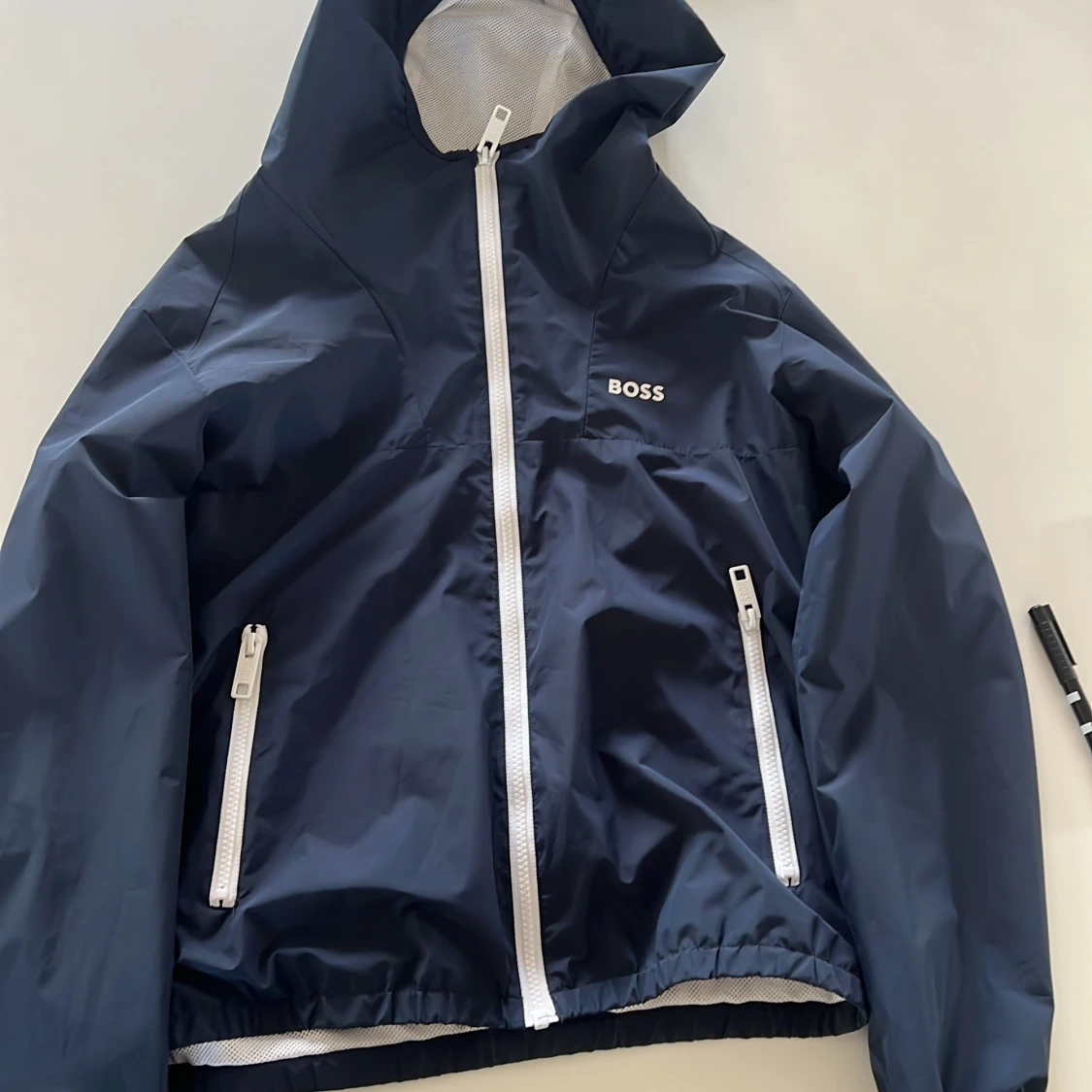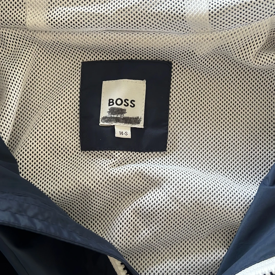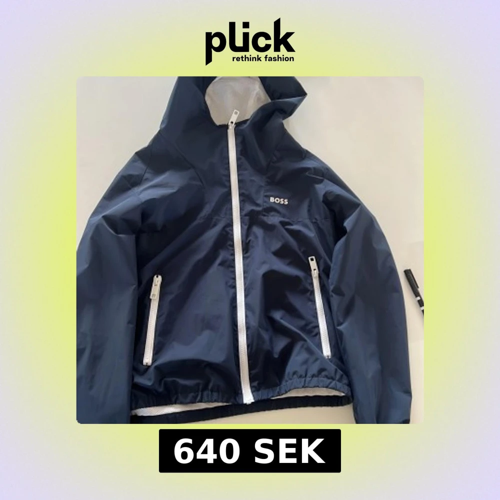 Snygg mörkblå vindjacka från BOSS med vit dragkedja och huva. Jackan har två fickor med dragkedja och meshfoder på insidan för extra komfort. Endast använd fåtal gånger! Den är i storleken 14-s (barnstorlekar) vilket motsvarar ungefär s-xs i (herrstorlekar). Ny pris är ca 2000 kr och mitt pris är 379kr. Perfekt för blåsiga dagar och enkel att matcha med olika outfits. Skriv bara vid minsta fråga, priset kan diskuteras!