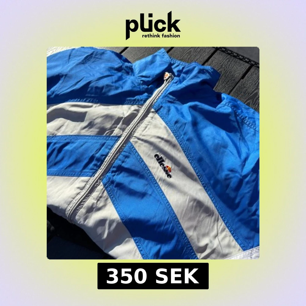 Säljer en retro vindjacka från Ellesse i blått, grått och vitt med dragkedja och hög krage. Jackan har ett sportigt mönster och Ellesse-logga på bröstet. Perfekt för dig som gillar vintage streetwear. Storleken är 50 vilken är ungefär L