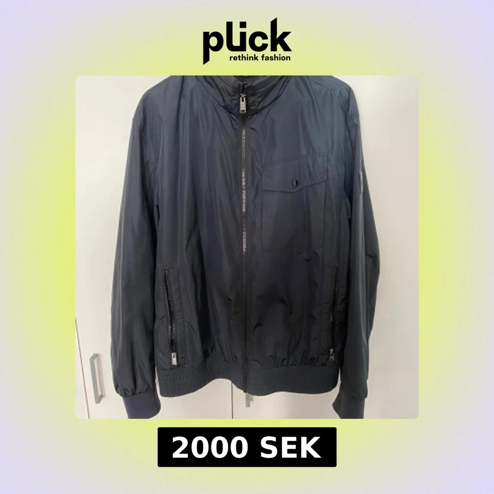 Säljer en mörkblå vindjacka från Hugo Boss med dragkedja framtill, två sidofickor med dragkedja och en bröstficka med knapp. Jackan har ribbade muddar och diskret BOSS-logga på bröstet. Perfekt för blåsiga dagar.