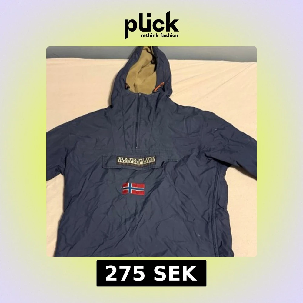 Säljer en blå vindjacka från Napapijri med huva och halv dragkedja. Jackan har en stor ficka framtill med Napapijri-logga och ett broderat norskt flaggmärke. Insidan av huvan är beige och jackan har långa ärmar med resår vid ärmslut.