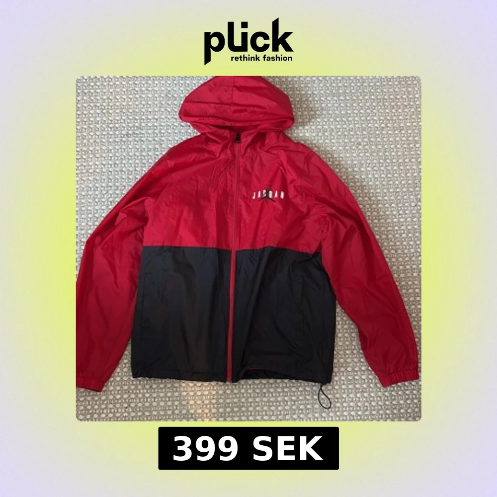Säljer en tvåfärgad air Jordan vindjacka i rött och svart med huva och dragkedja. Jackan har en stor logga på ryggen och mindre logga på bröstet. Lättviktigt material och meshfoder, perfekt för streetwear. Snygg loose fit och klassisk sportig look. Storleken är L och modellen är 179 65kg. Köpt på Intersport i Stockholm för 1200