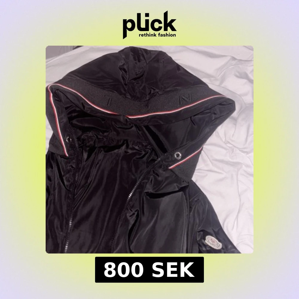 Snygg svart jacka från Moncler med huva och dragkedja. Jackan har en stilren design med Moncler-logga på ärmen och detaljer i rött och vitt. Perfekt för en cool och avslappnad stil. Lite stor i storleken men passar endå🩷