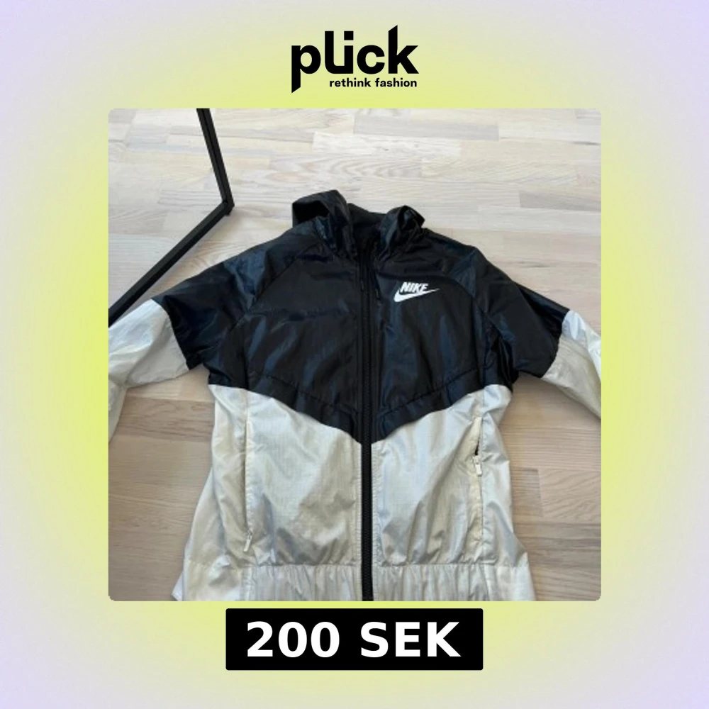Nike vindjacka i svart och vit med dragkedja framtill och huva. Jackan har en sportig look med logga på bröstet och praktiska fickor. Perfekt för blåsiga dagar och enkel att matcha till olika outfits.