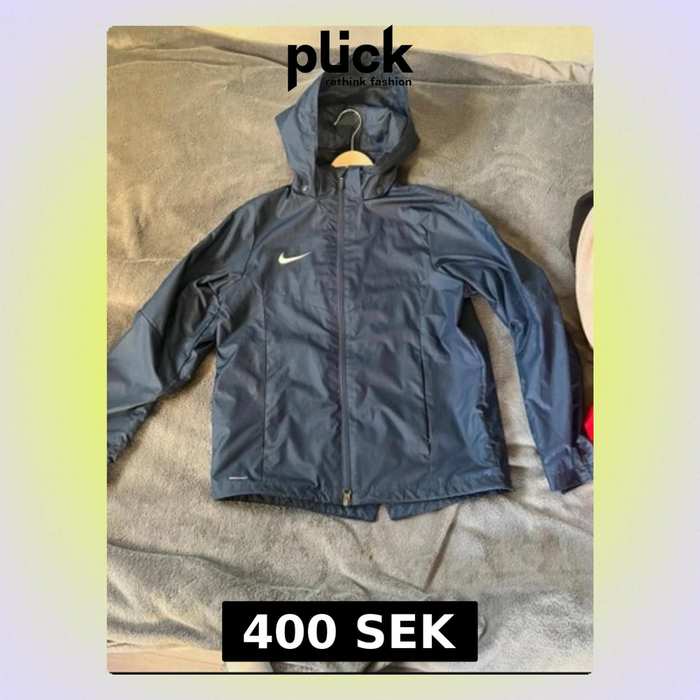 Säljer en marinblå Nike Shield vindjacka i storlek XL för barn asså s . Jackan har huva, hel dragkedja framtill och två sidofickor. Materialet är lätt och vattenavvisande polyester, perfekt för blåsiga dagar. Snygg och sportig design med Nike-logga på bröstet.