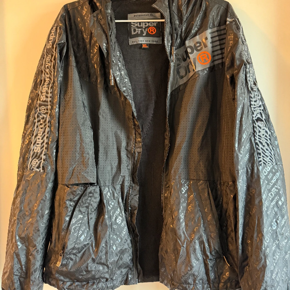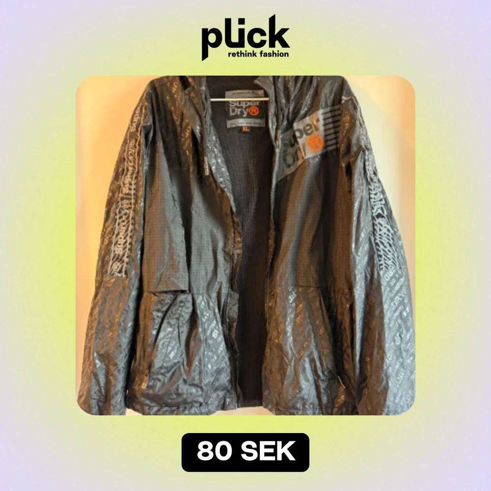 Regnjacka från superdry i storlek XL, men från junioravdelningen. Passar S ungefär