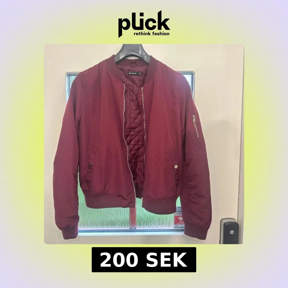 Säljer en vinröd bomberjacka från stradivarius med quiltat innerfoder. Jackan har dragkedja framtill, fickor med tryckknappar och en ärmficka med dragkedja. Klassisk bombermodell med ribbade muddar vid ärmslut och midja.