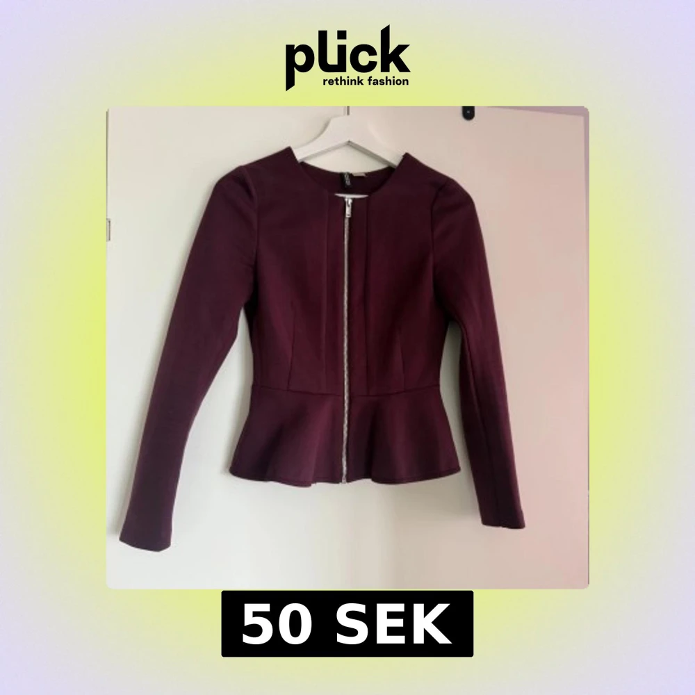 Snygg vinröd jacka från H&M med dragkedja framtill. Jackan har en figursydd passform och peplum-detalj vid midjan. Perfekt för att ge en elegant touch till din outfit.