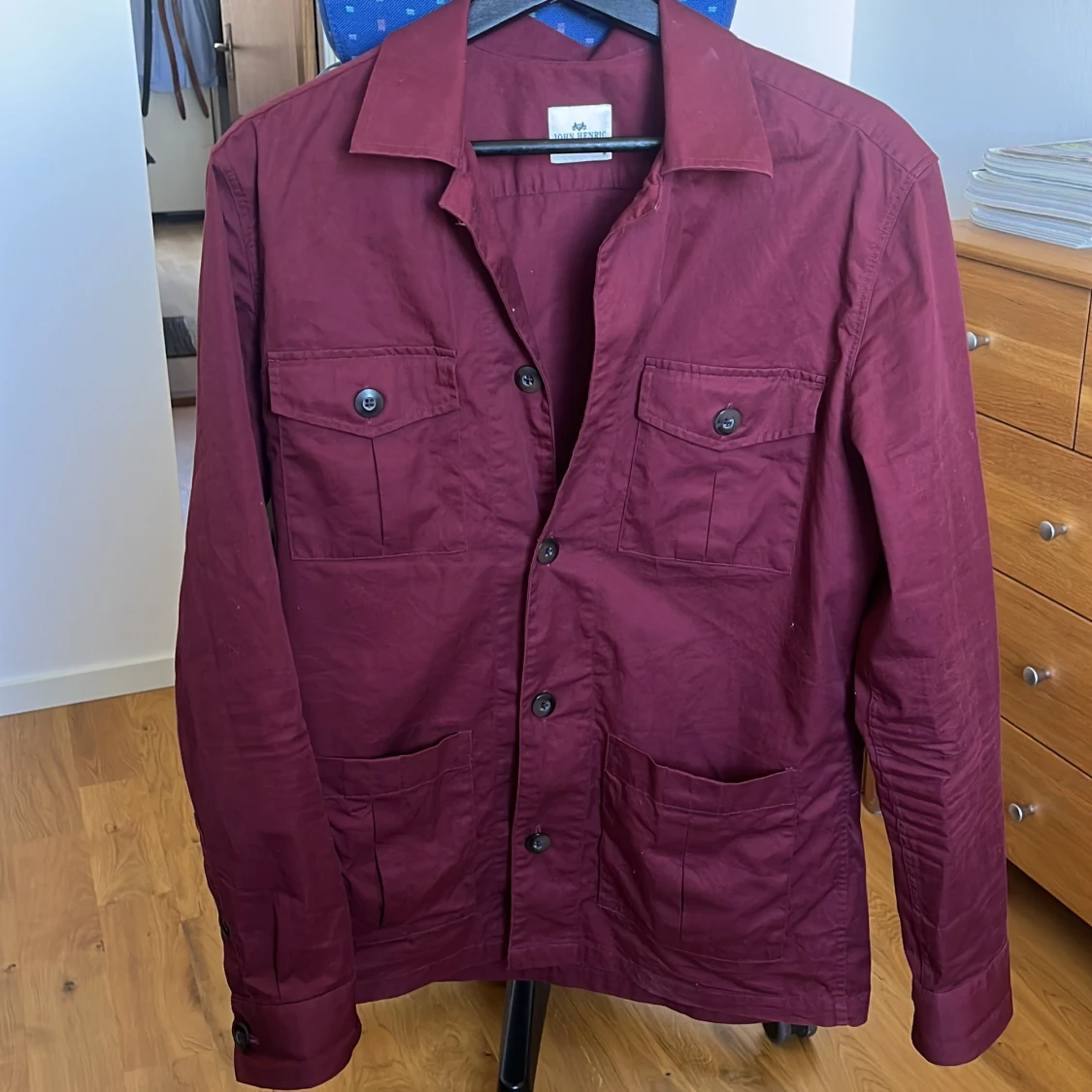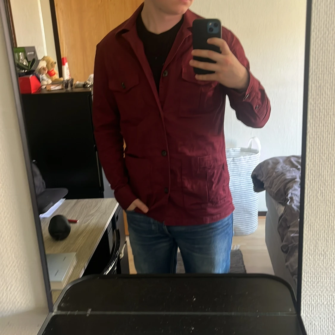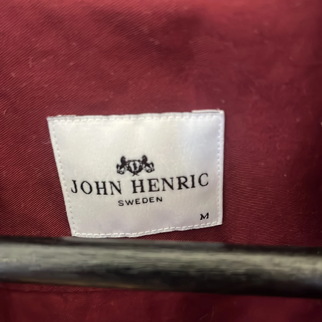 Säljer en vinröd jacka från John Henric med klassisk krage och stora fickor framtill. Jackan har knäppning med knappar och är långärmad. Perfekt för dig som vill ha en stilren och enkel look.