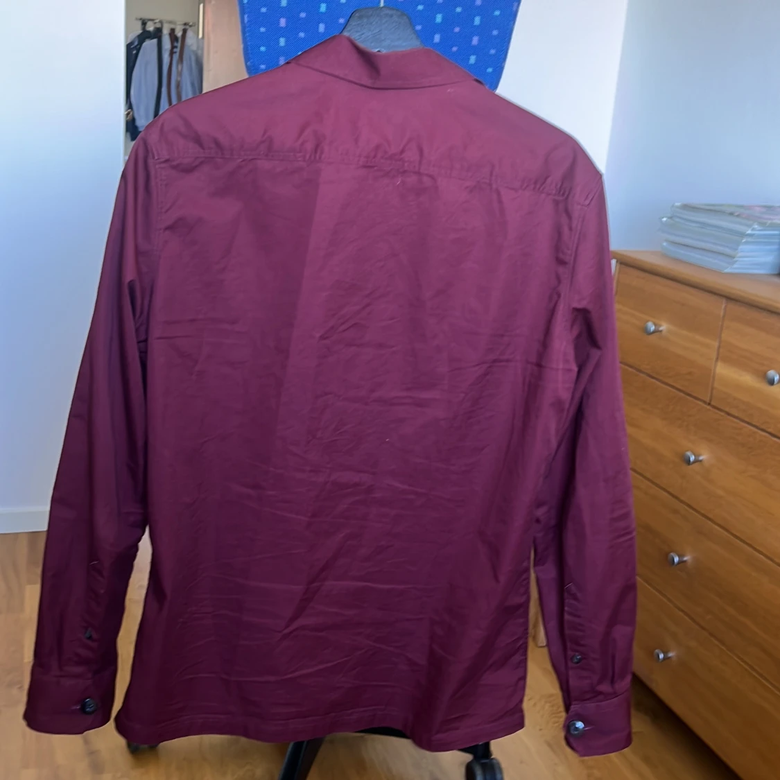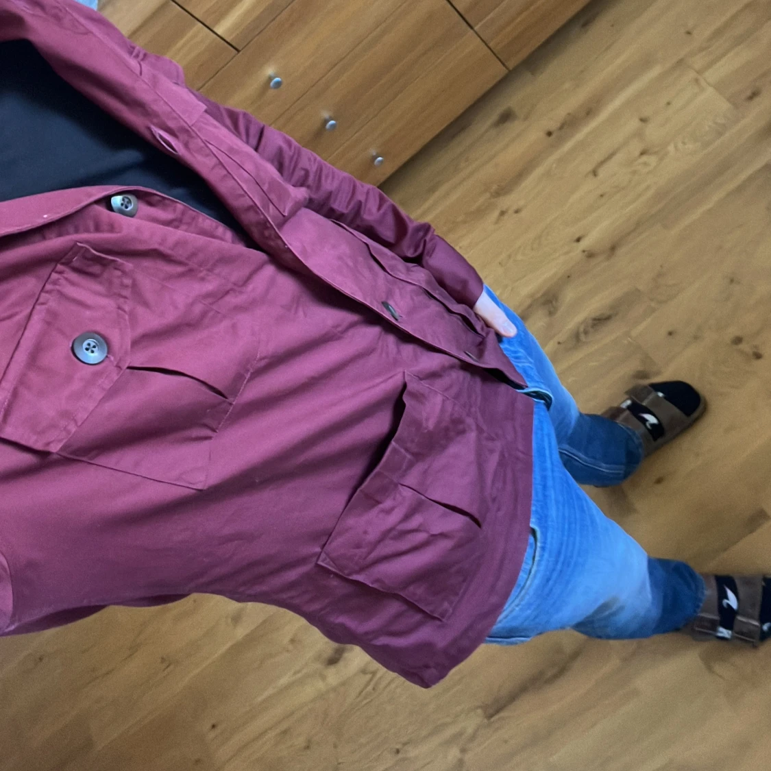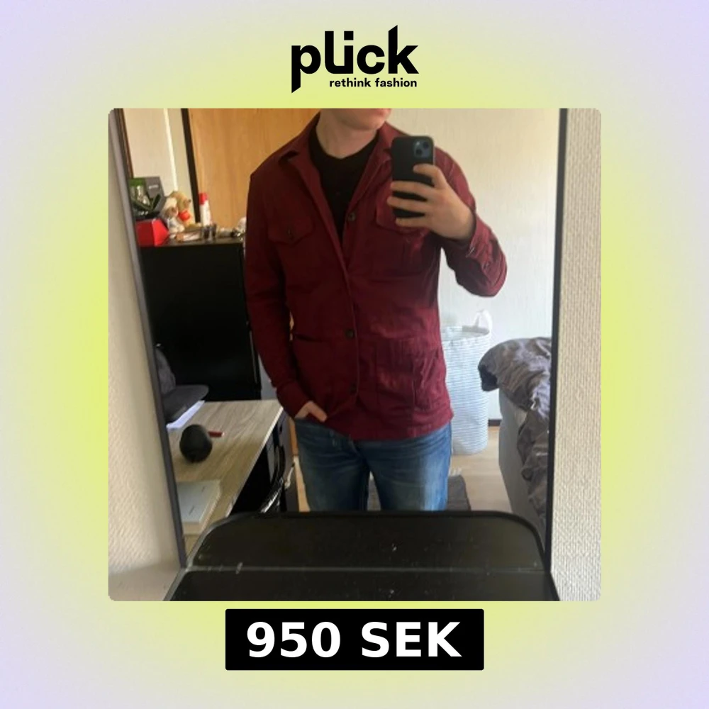 Säljer en vinröd jacka från John Henric med klassisk krage och stora fickor framtill. Jackan har knäppning med knappar och är långärmad. Perfekt för dig som vill ha en stilren och enkel look.