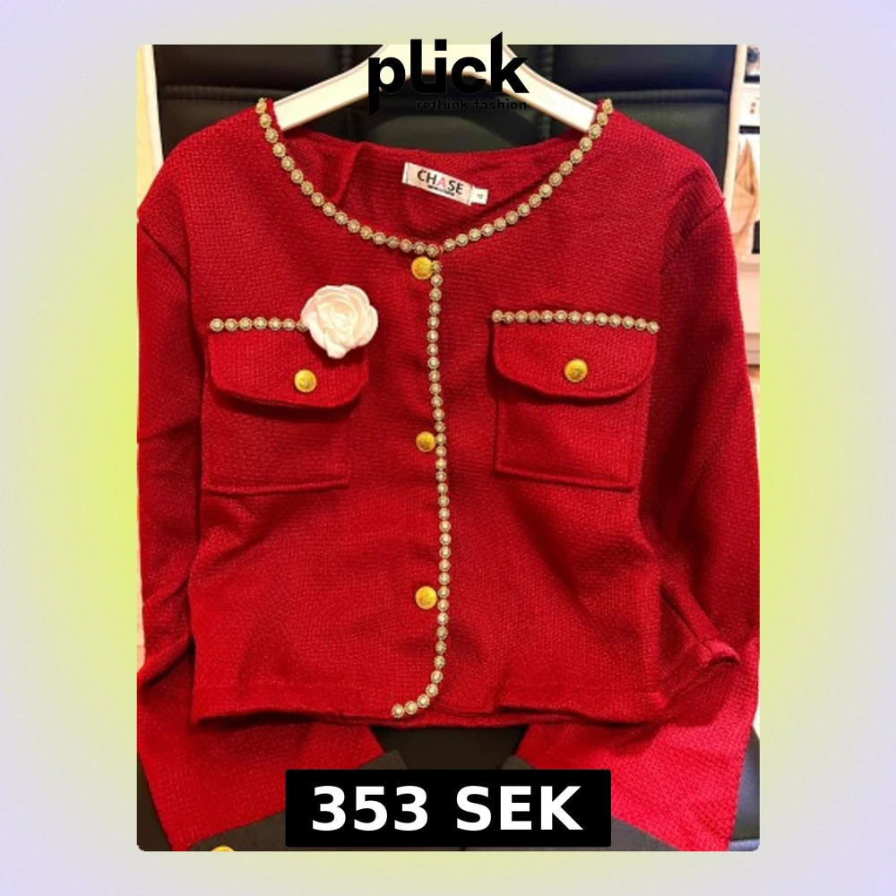 Snygg röd med guldfärgade knappar och dekorativa gulddetaljer längs kanterna. Jackan har två fickor framtill och en vit blomma som accessoar på bröstet. Perfekt för dig som vill sticka ut med en elegant och trendig look.