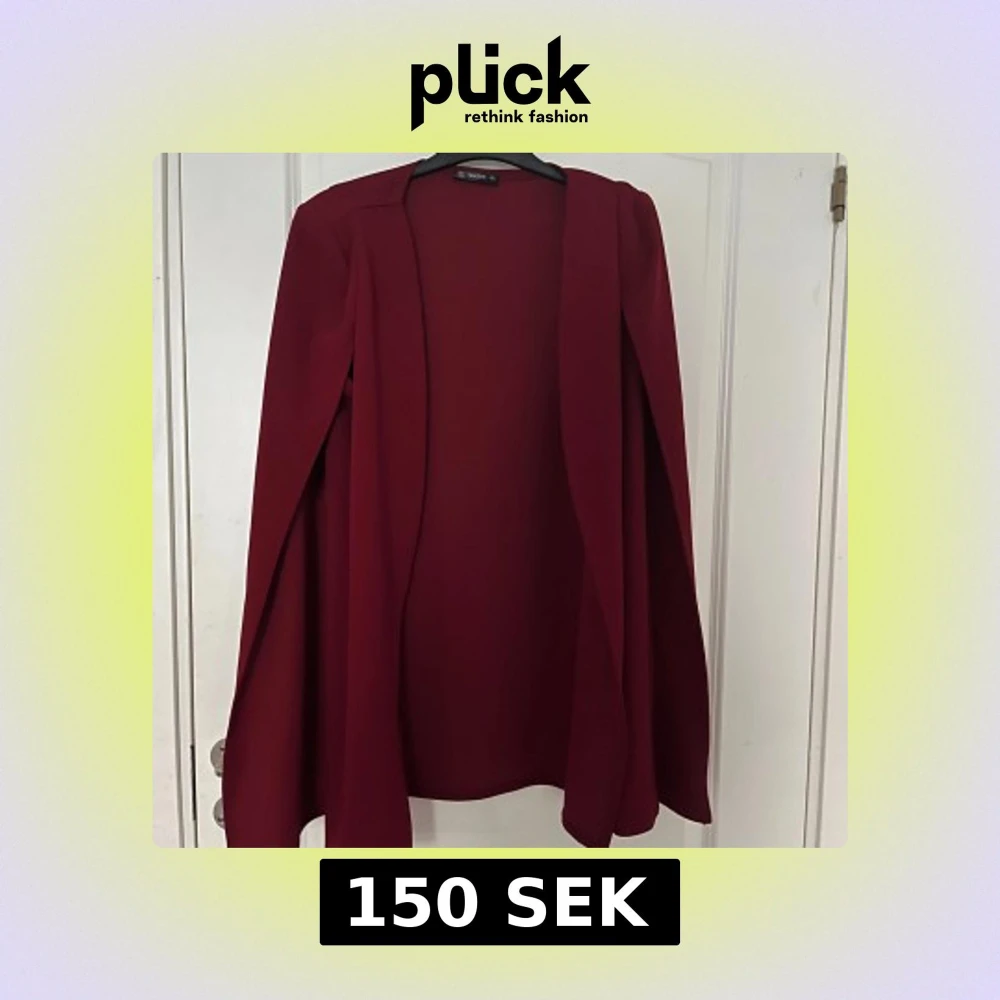 Säljer en vinröd kavaj med unika capeärmar. Jackan har en elegant och stilren design utan knäppning framtill. Perfekt för dig som vill sticka ut med en trendig look.