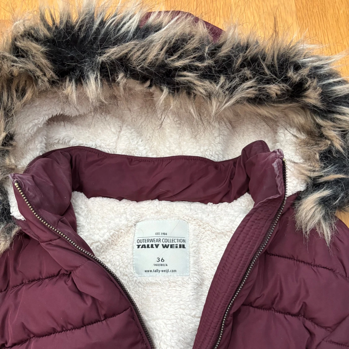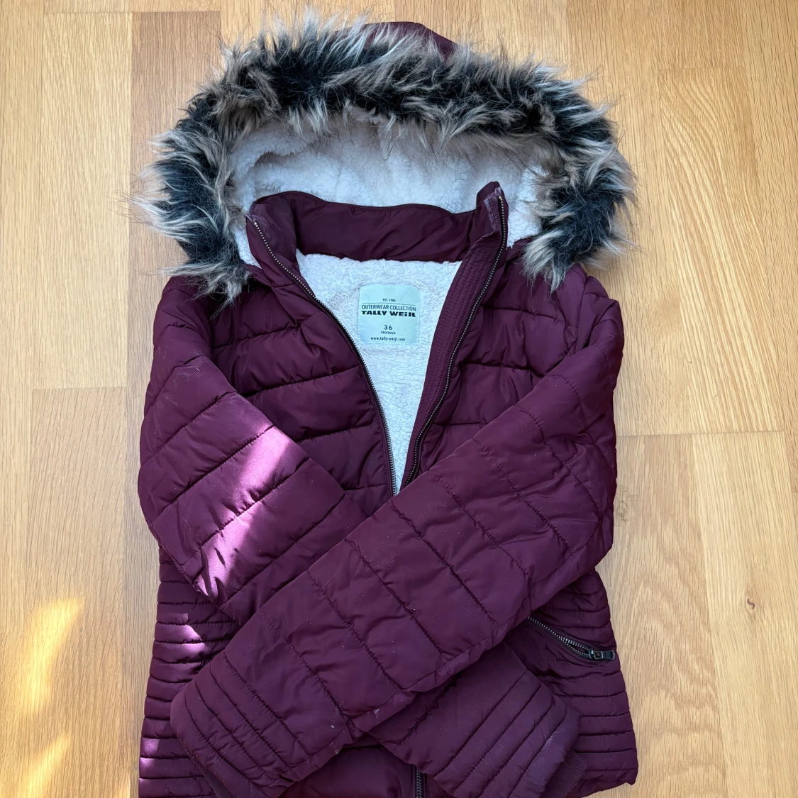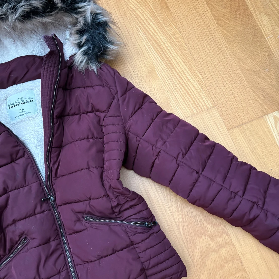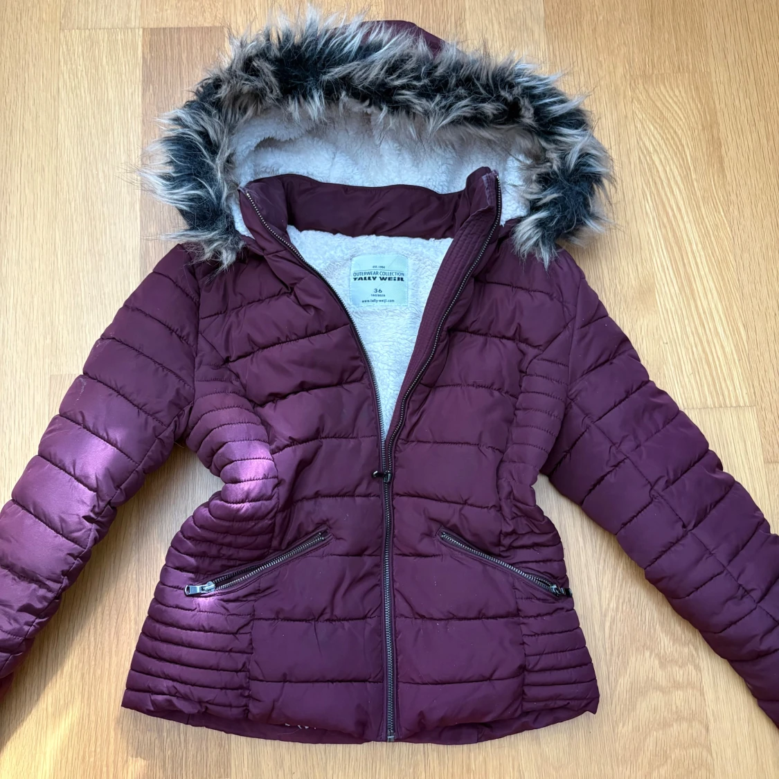 Snygg vinröd pufferjacka från Tally Weijl med fuskpäls på luvan och mysigt vitt foder. Jackan har dragkedja framtill, två fickor med dragkedja och quiltade detaljer. Perfekt för kalla dagar när du vill hålla stilen och värmen. Tajt passform med några få skavanker som inte märks till så mycket 💞💞💞