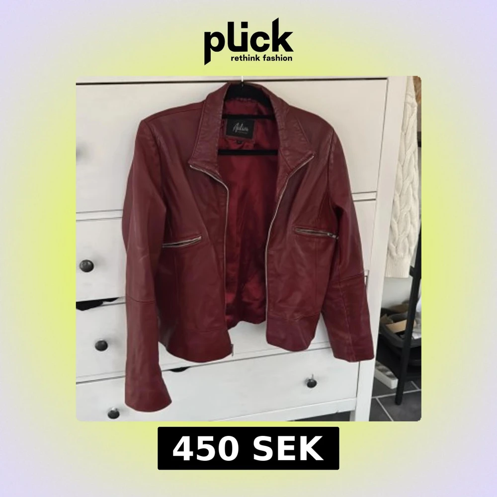 Snygg vinröd skinnjacka från Atalina med klassisk krage och raka linjer. Jackan är i storlek L men passar mig som har storlek S, den har två zip-detaljerade fickor framtill och hel dragkedja. Materialet är mjukt skinn och modellen är normal i passningen med långa ärmar. Perfekt för dig som vill ha en stilren och edgy look.