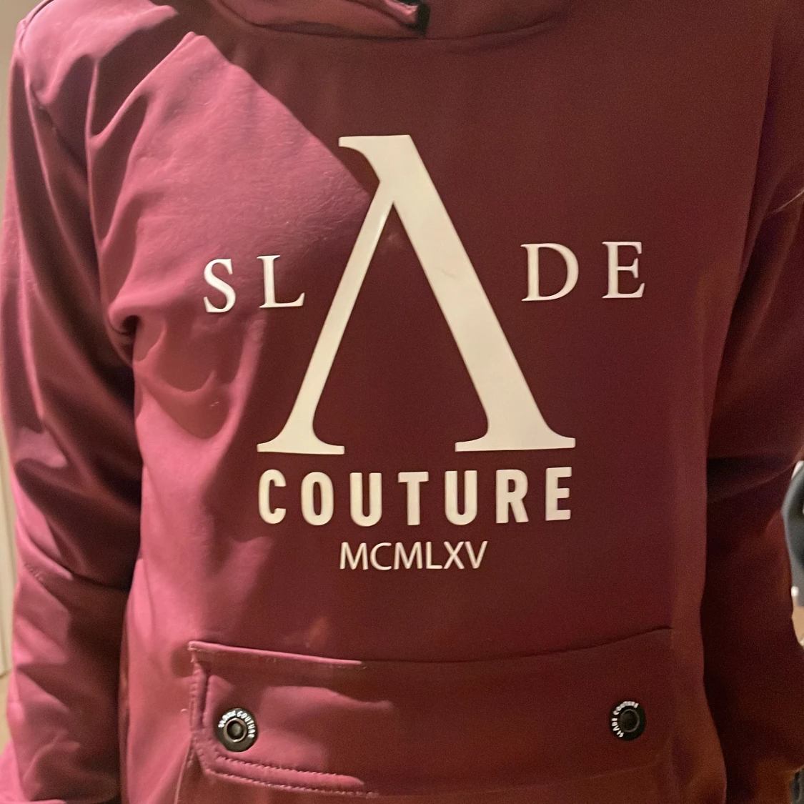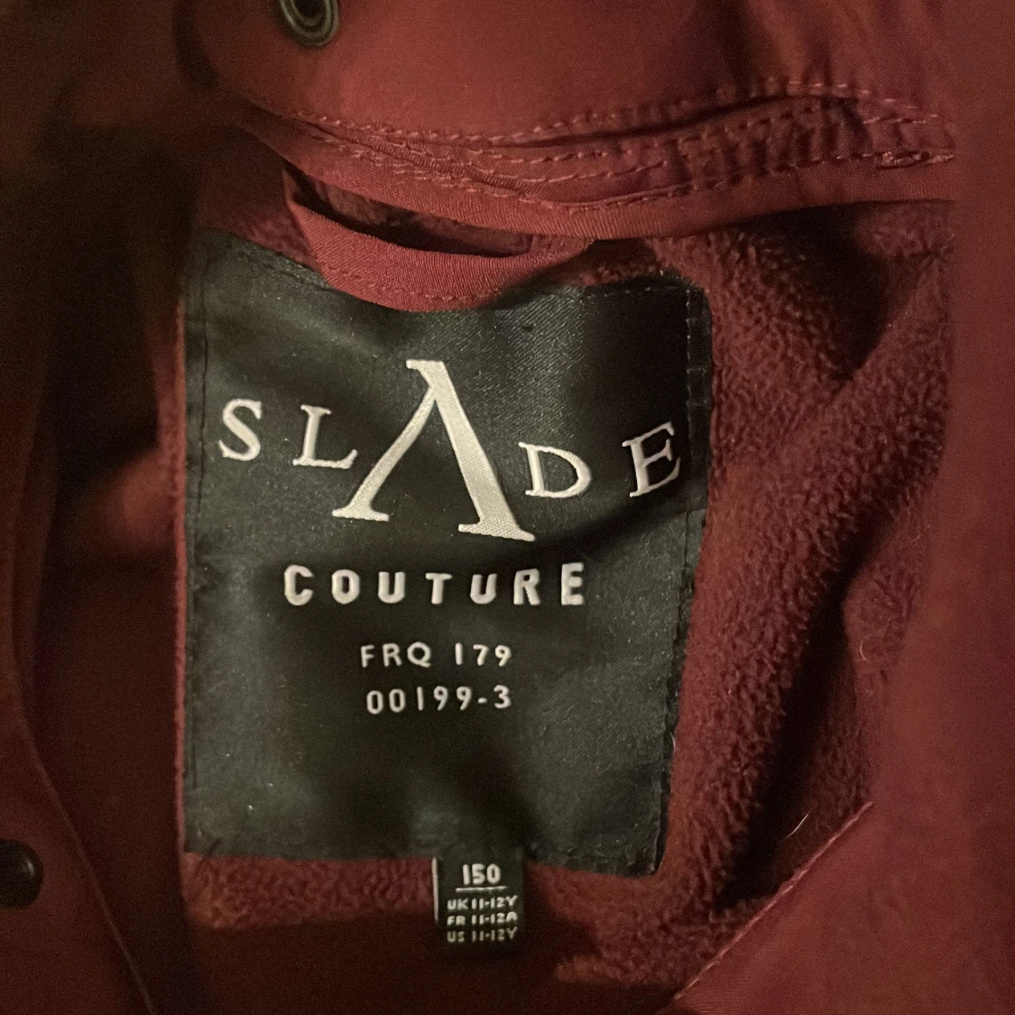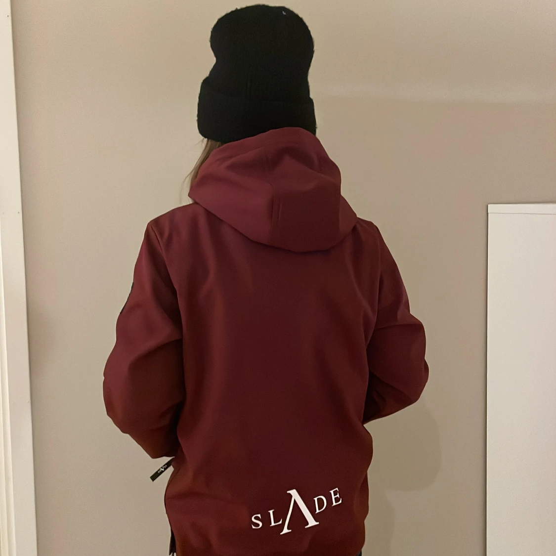 Snygg vinröd skidjacka med huva från Slade Couture som har blivit för liten. Stor vit logga framtill och baktill, praktisk magficka med knappar och dragkedja i sidan. Jackan har en clean look och passar perfekt till höst och vinter.