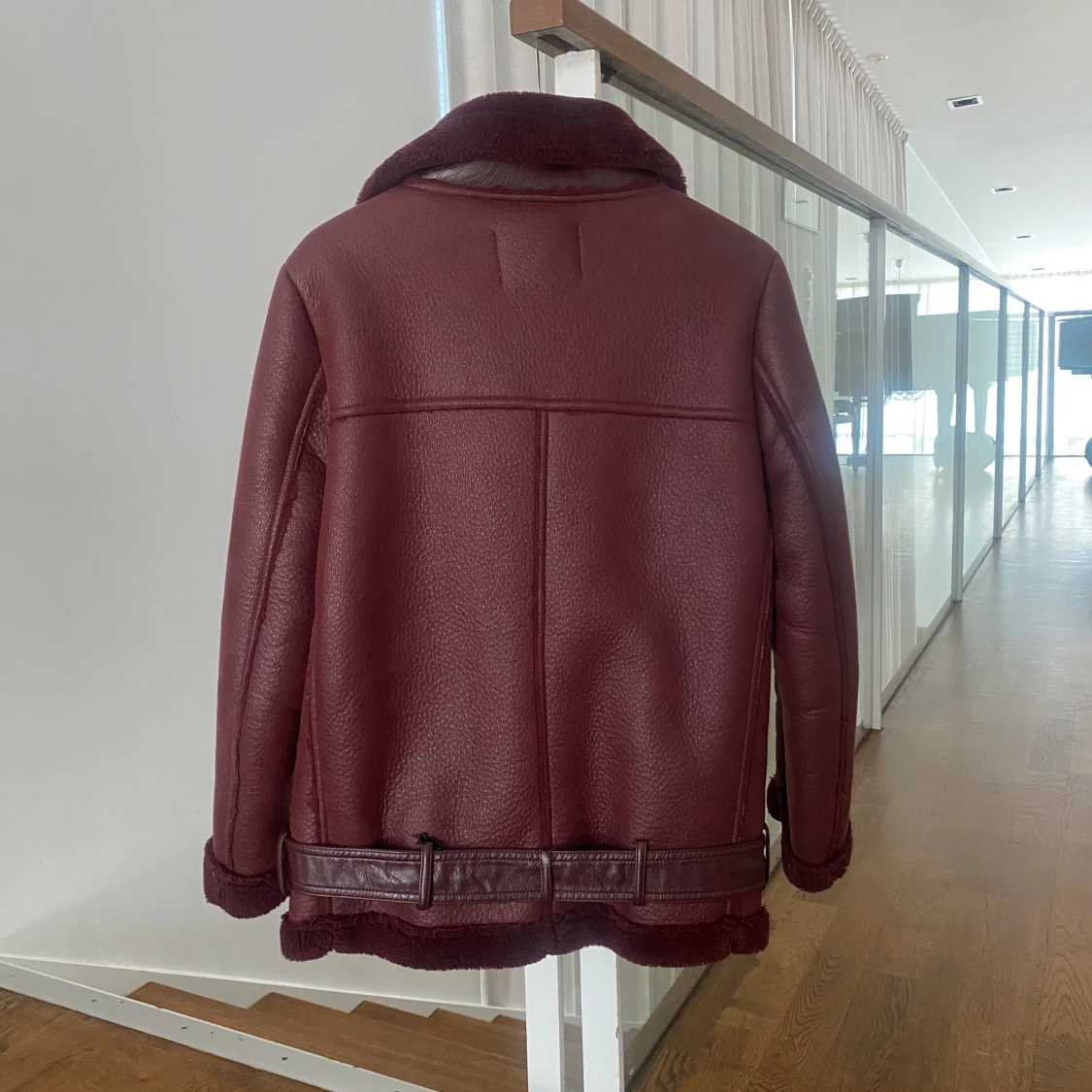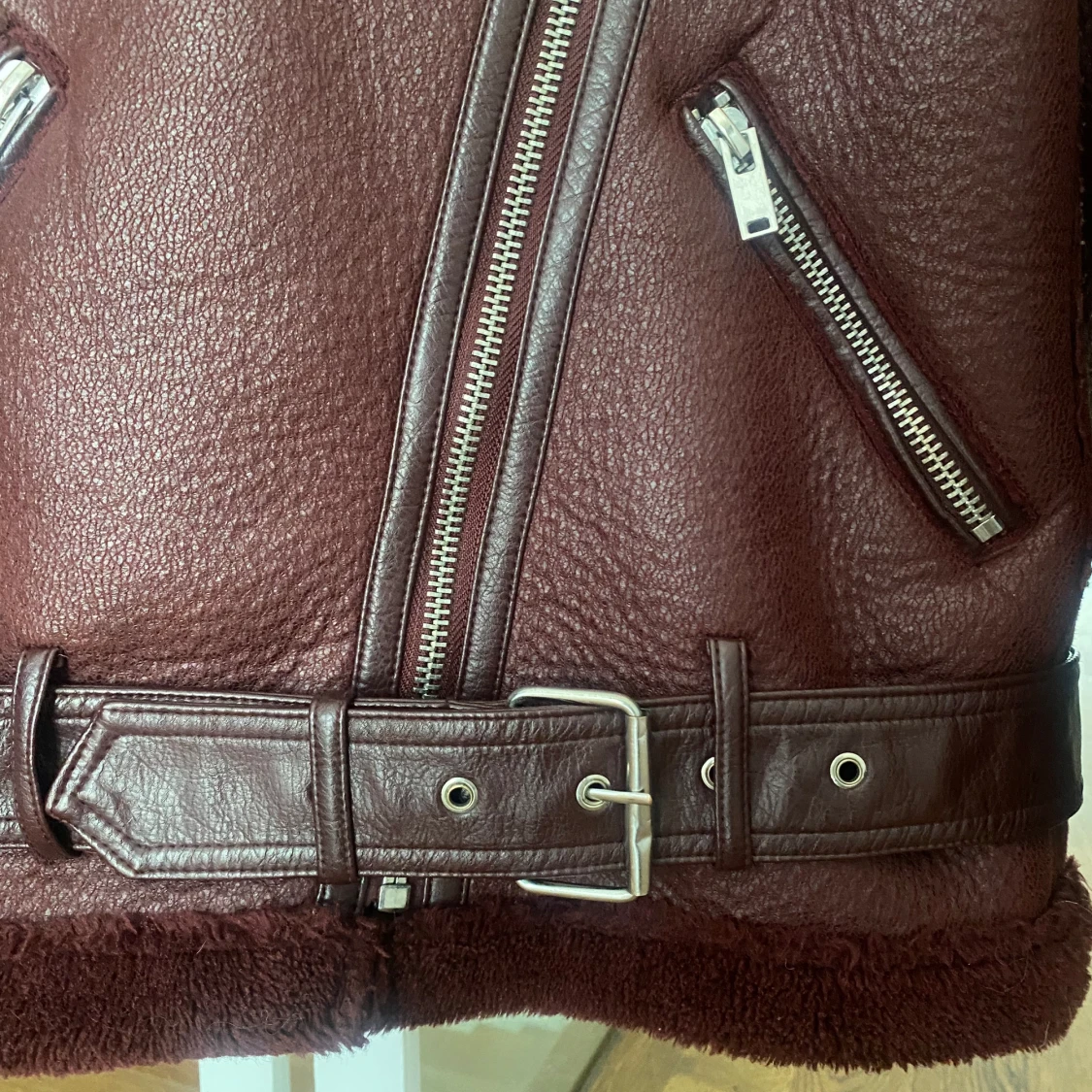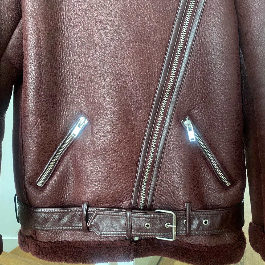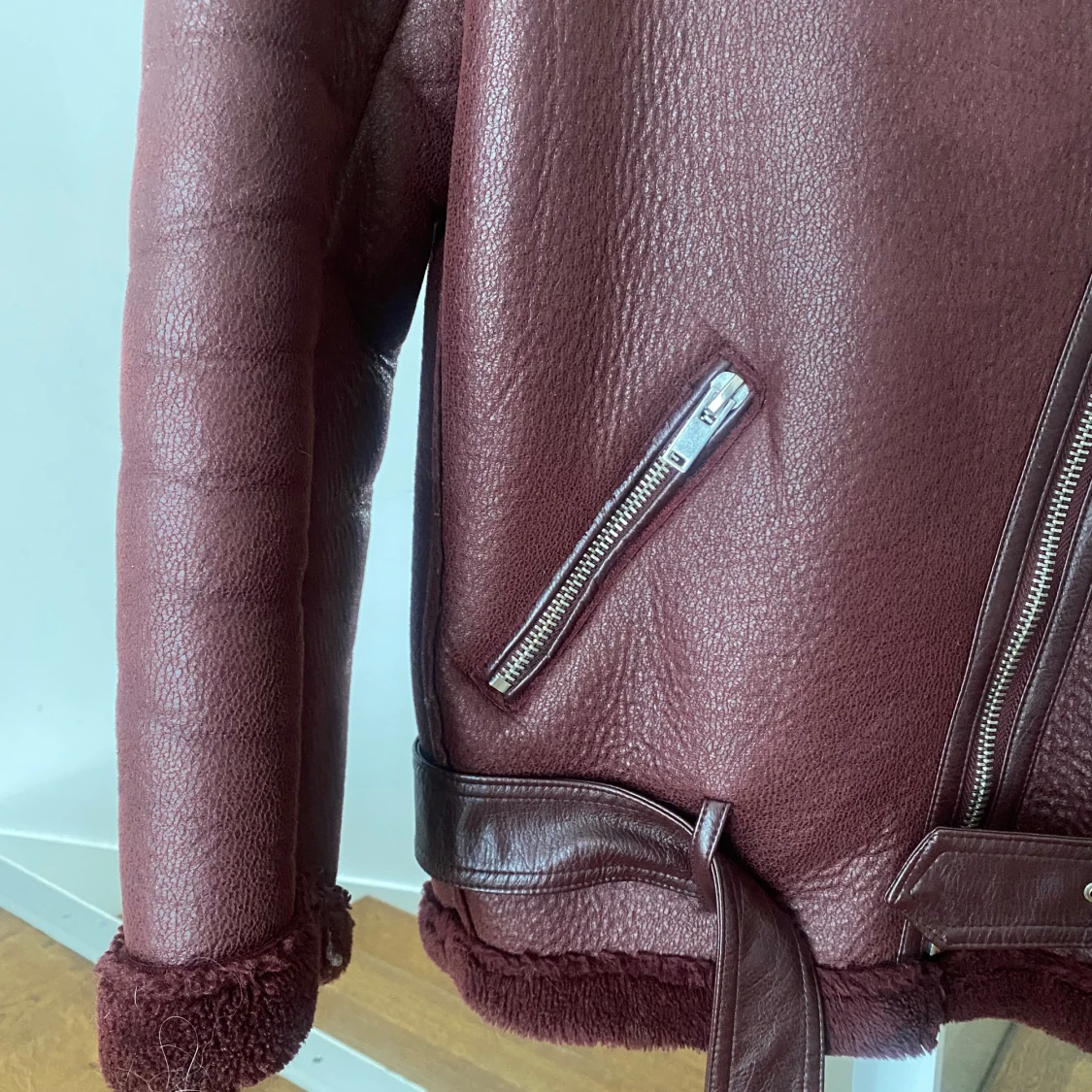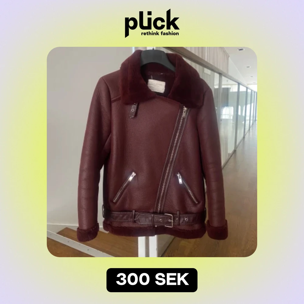 Vinröd bikerjacka från Zara i storlek xs! Bra skick utan defekter, förutom att sömmar för banden som håller midjeskärpet har lossnat innan (men är väl lagat nu och syns ej)!