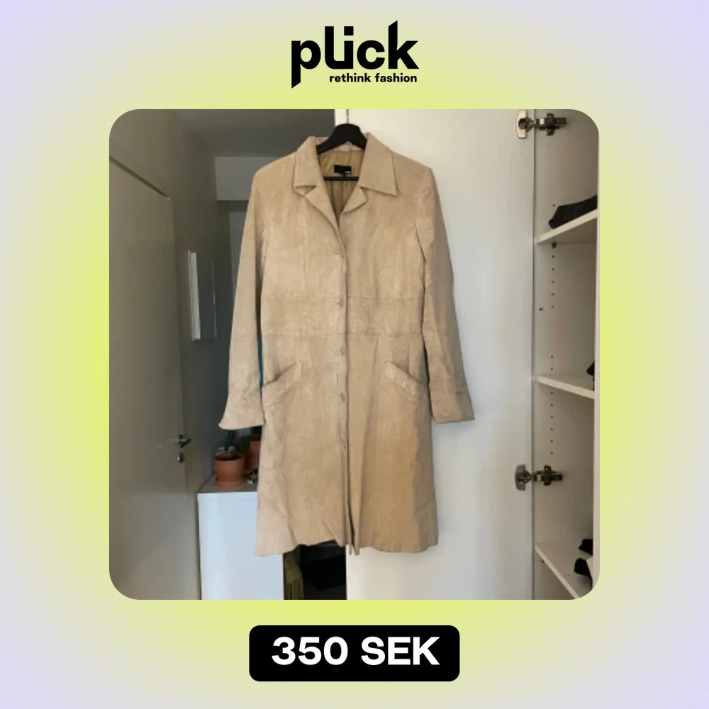 Superfin vårkappa i äkta mocka och vintage stuk som inte har blivit använd på länge. I väldigt fint skick, men den har fläckar på ryggen efter regn som jag tyvärr inte haft möjlighet att ta bort. Storlek 42, men sitter perfekt på storlek 36-38!
