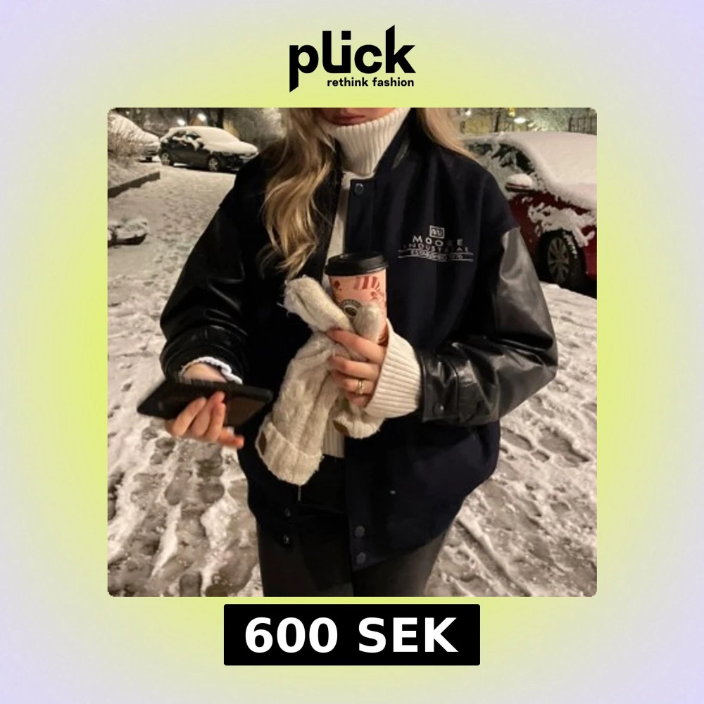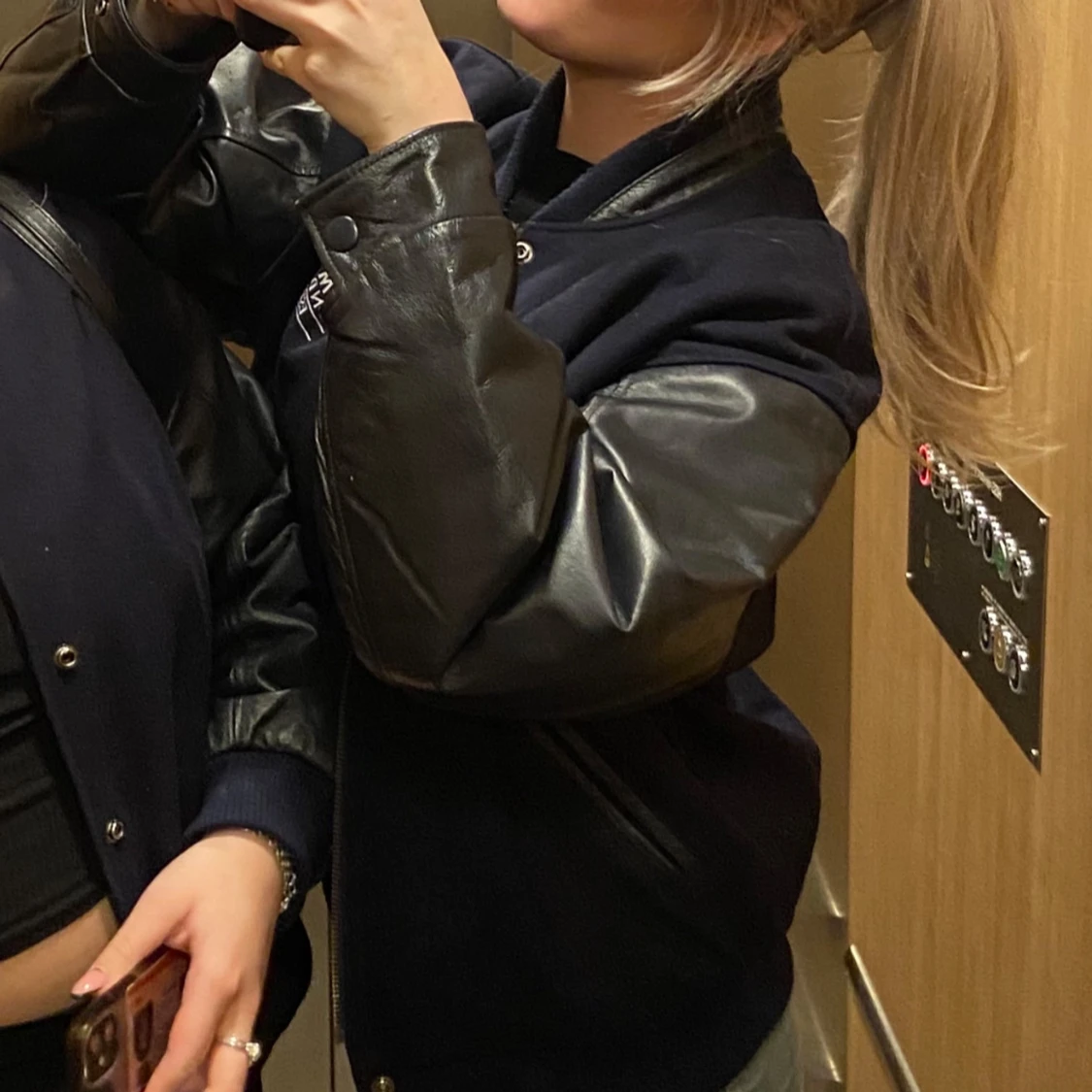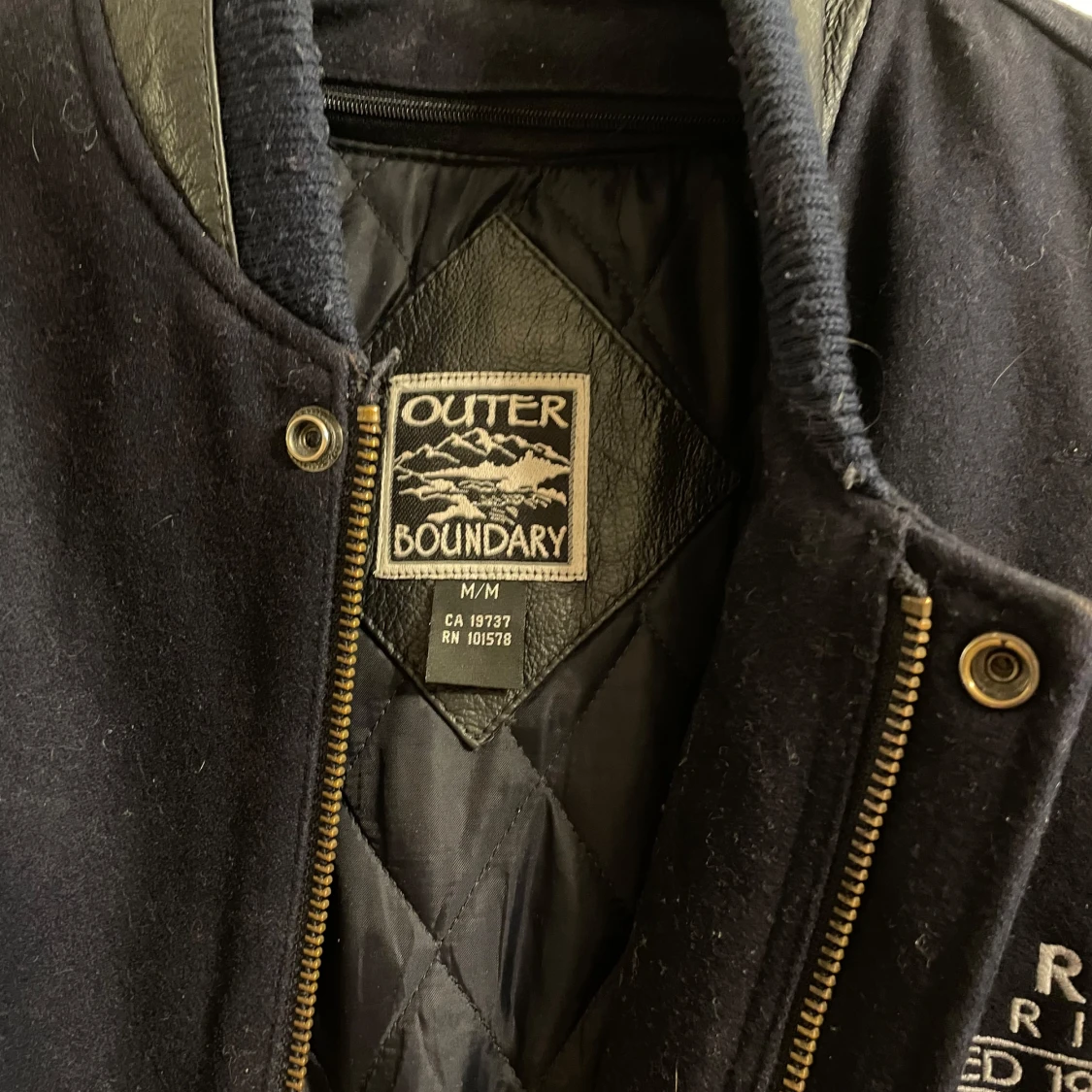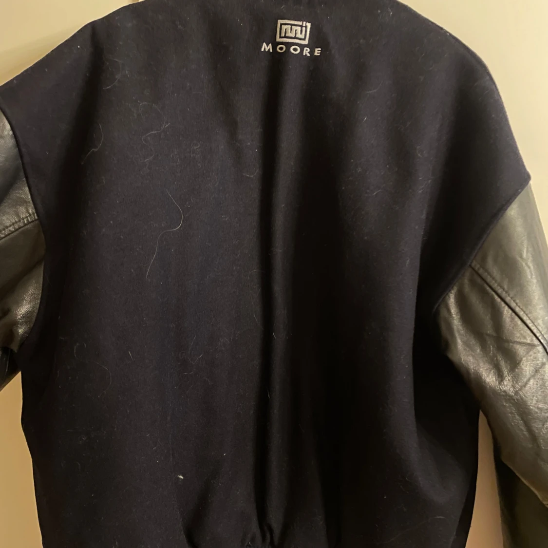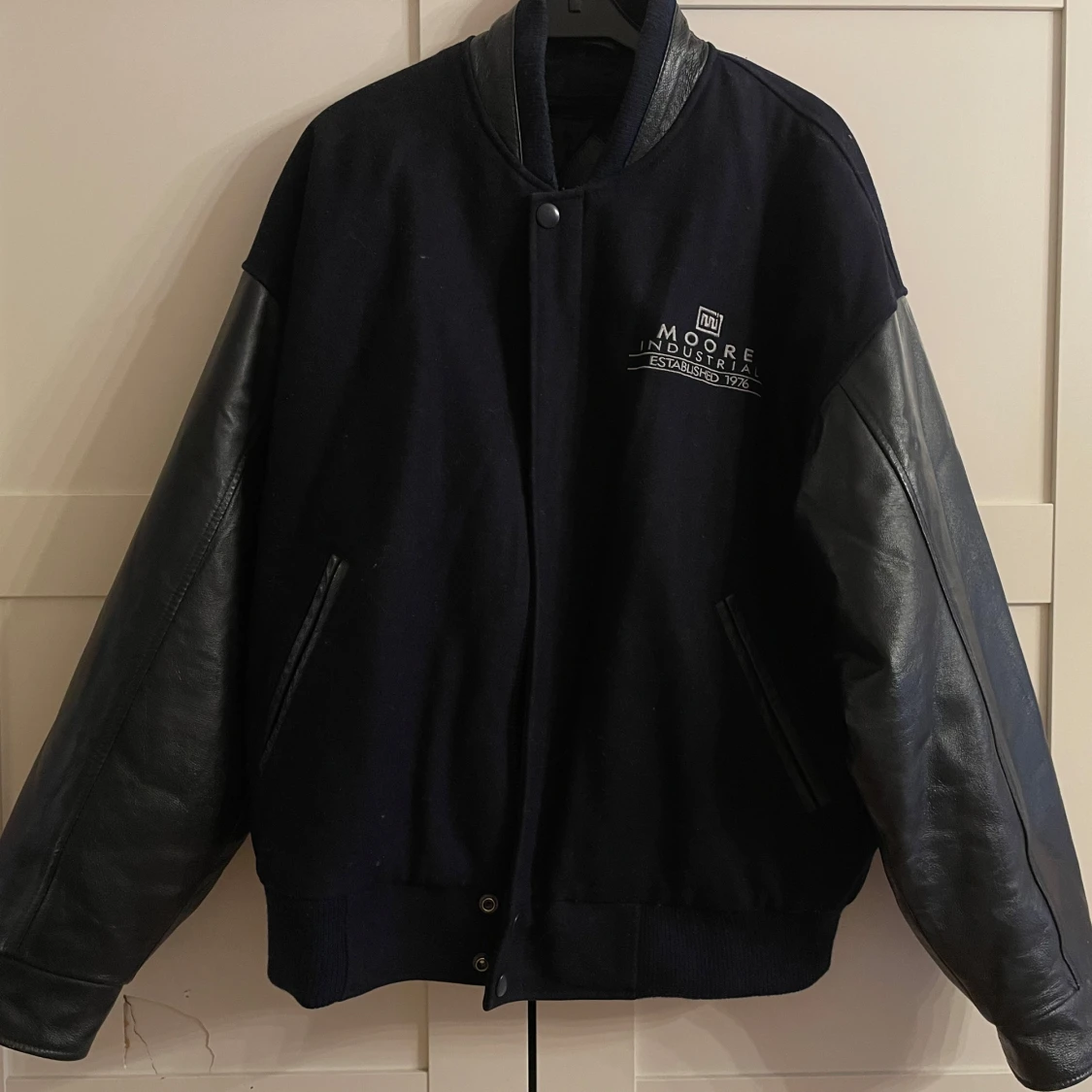 Säljer en svart jacka från Moore Industrial med läderärmar och broderad logga på bröstet. Jackan är vintage och inga defekter!